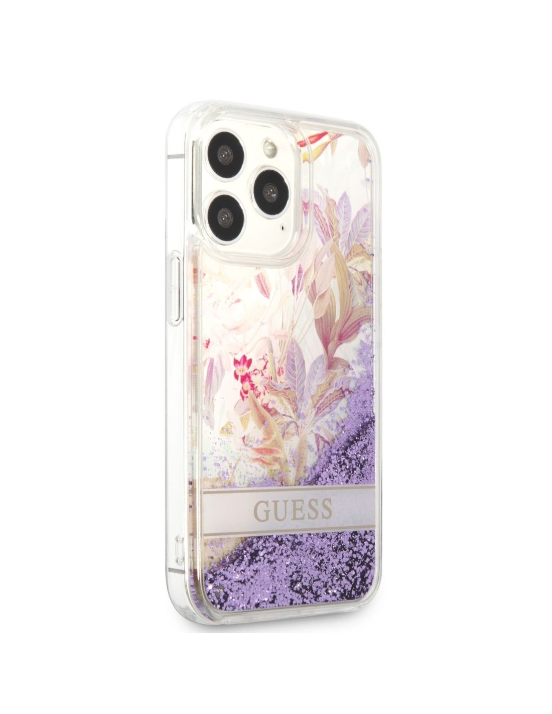 Funda de silicona de Guess con purpurina líquida para iPhone 13 Pro Max en color morado con flores. Diseño y elegancia para proteger tu iPhone 13 Pro Max de golpes y arañazos.