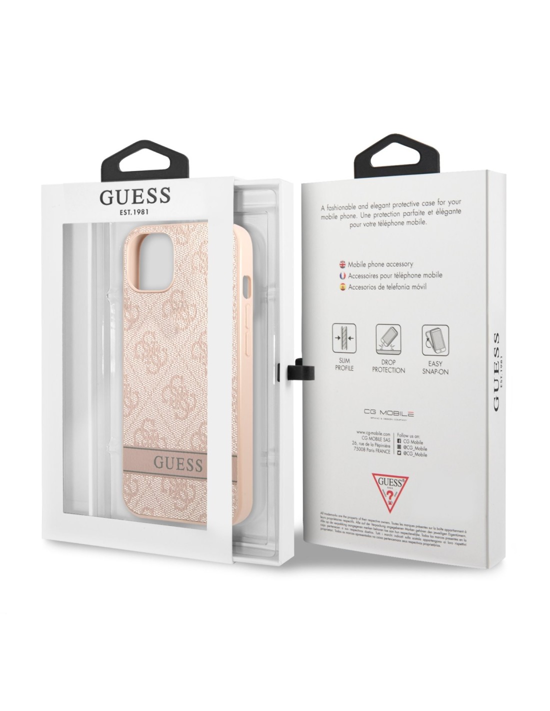 Funda Guess para iPhone 13 Mini Rosa con logo y franja Rosa.