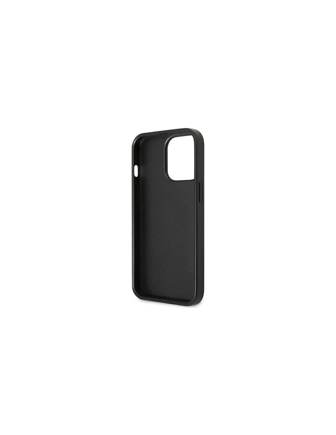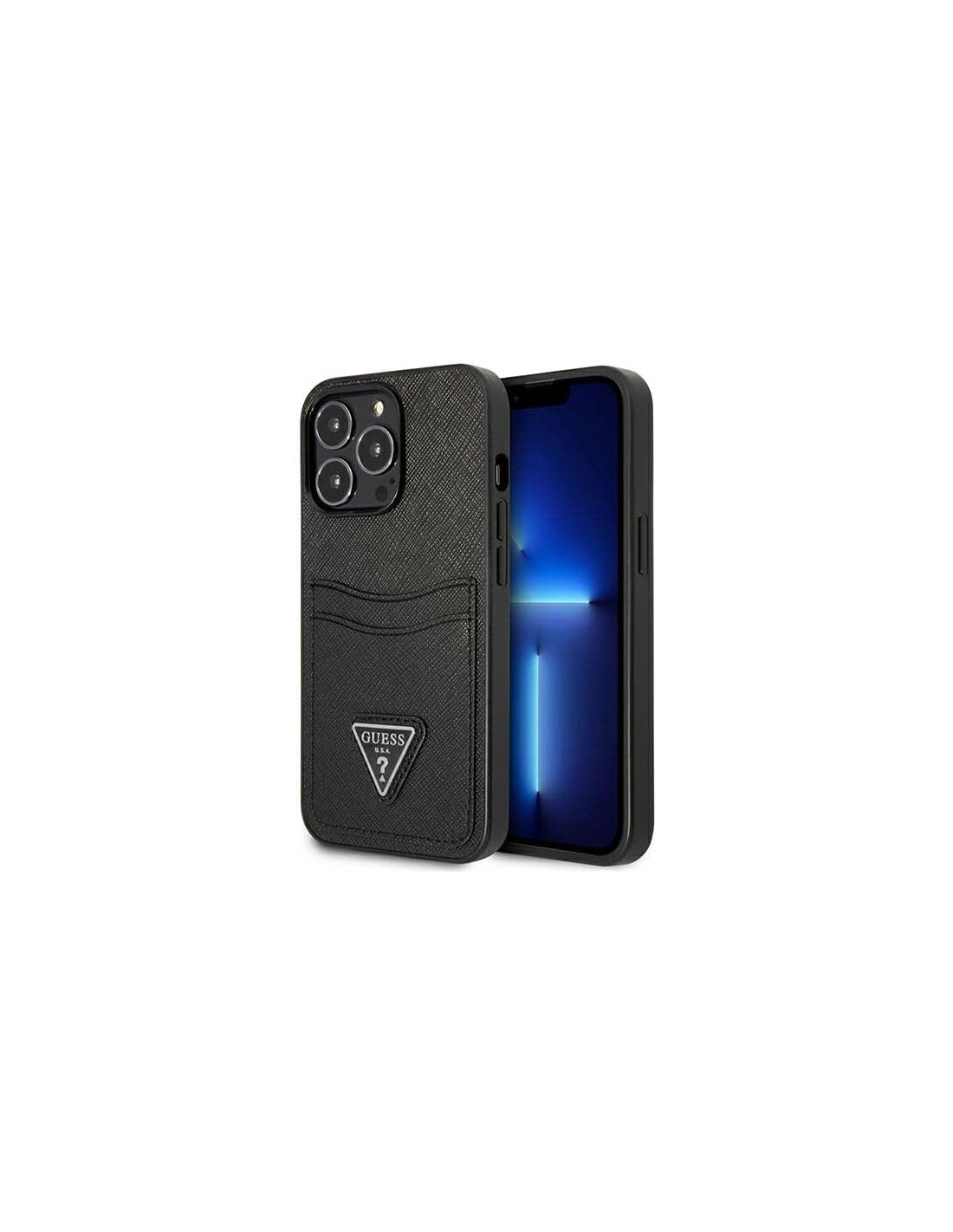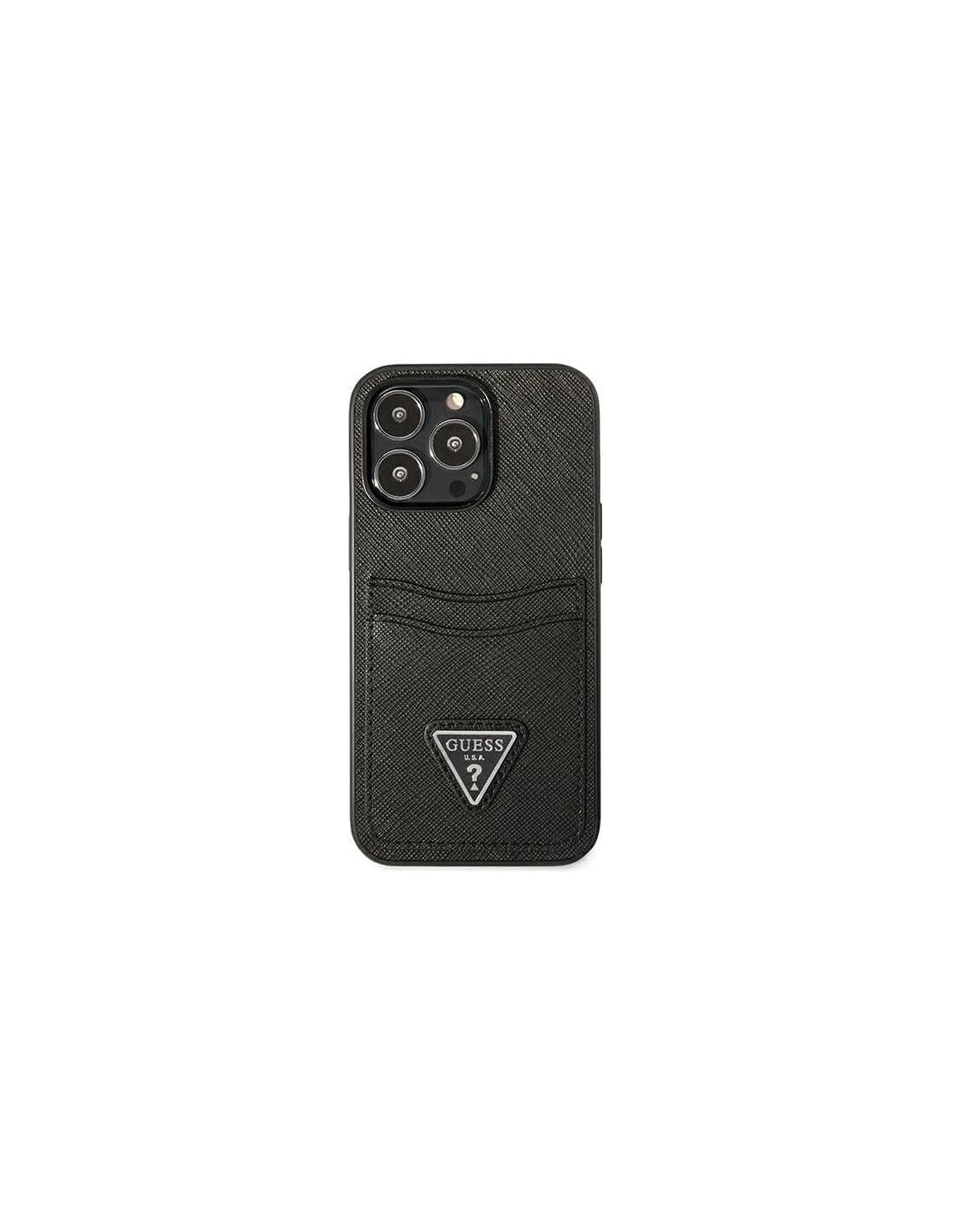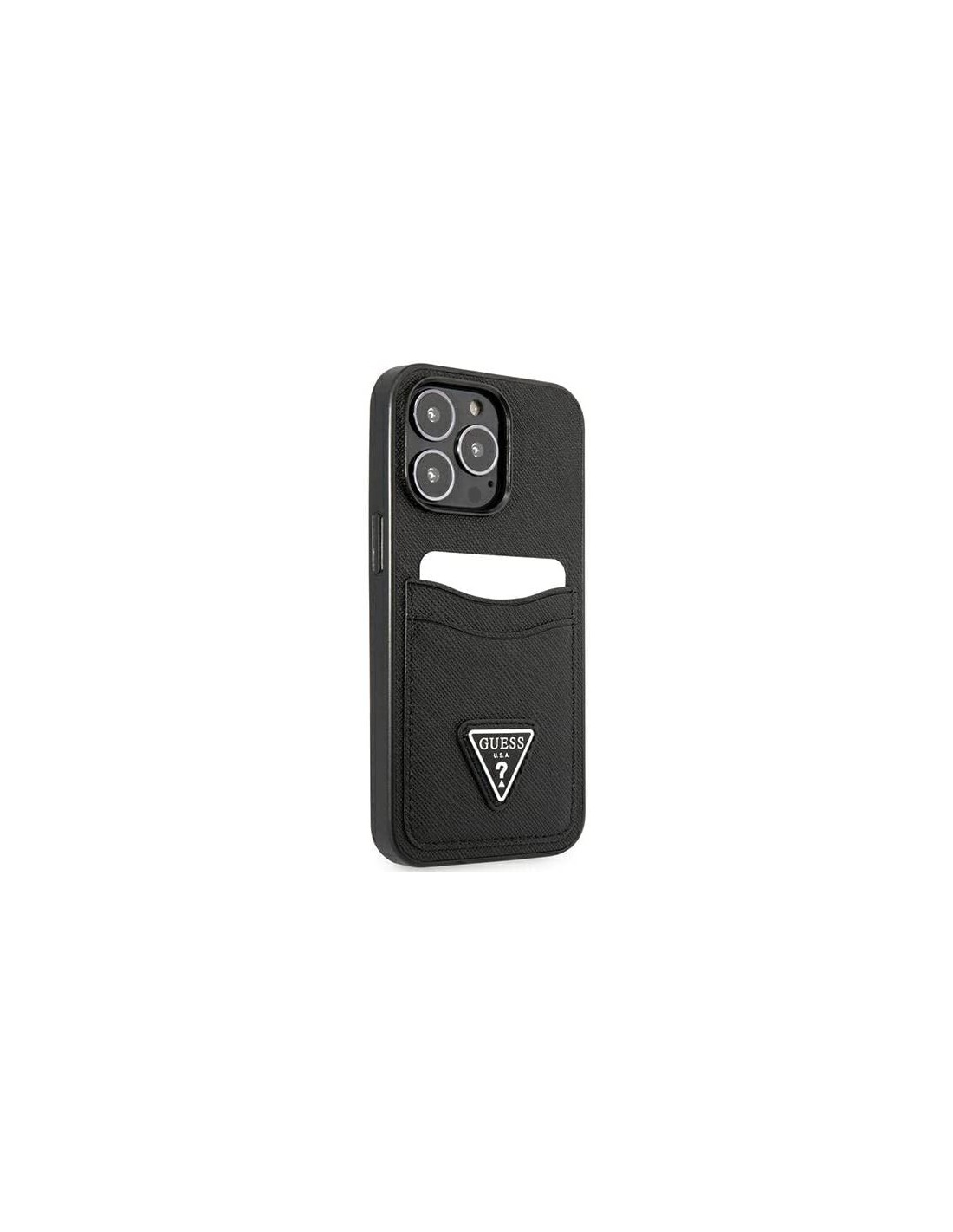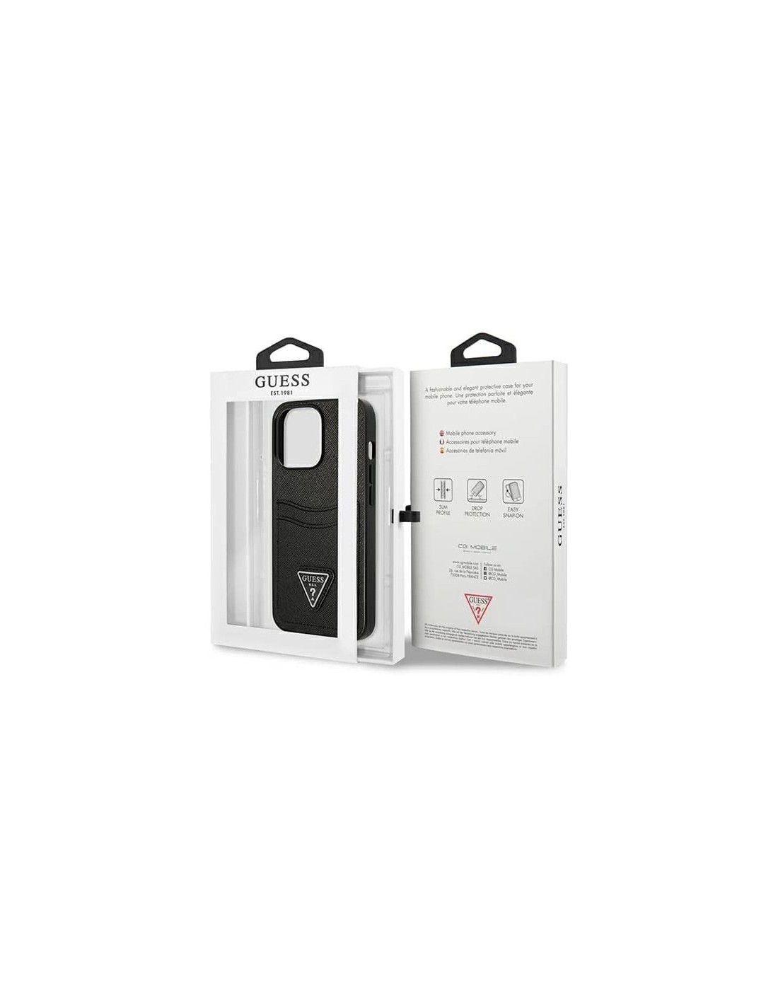 Funda Guess diseño Saffiano con tarjetero para Apple iPhone 13 Pro Max color Negro. Diseño y elegancia para proteger tu iPhone 13 Pro Max de golpes y arañazos.