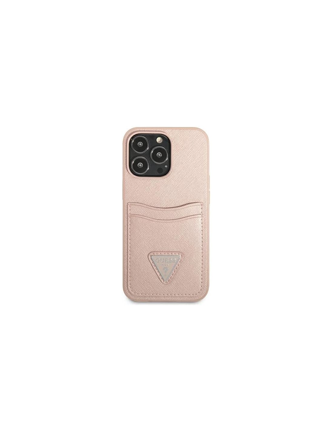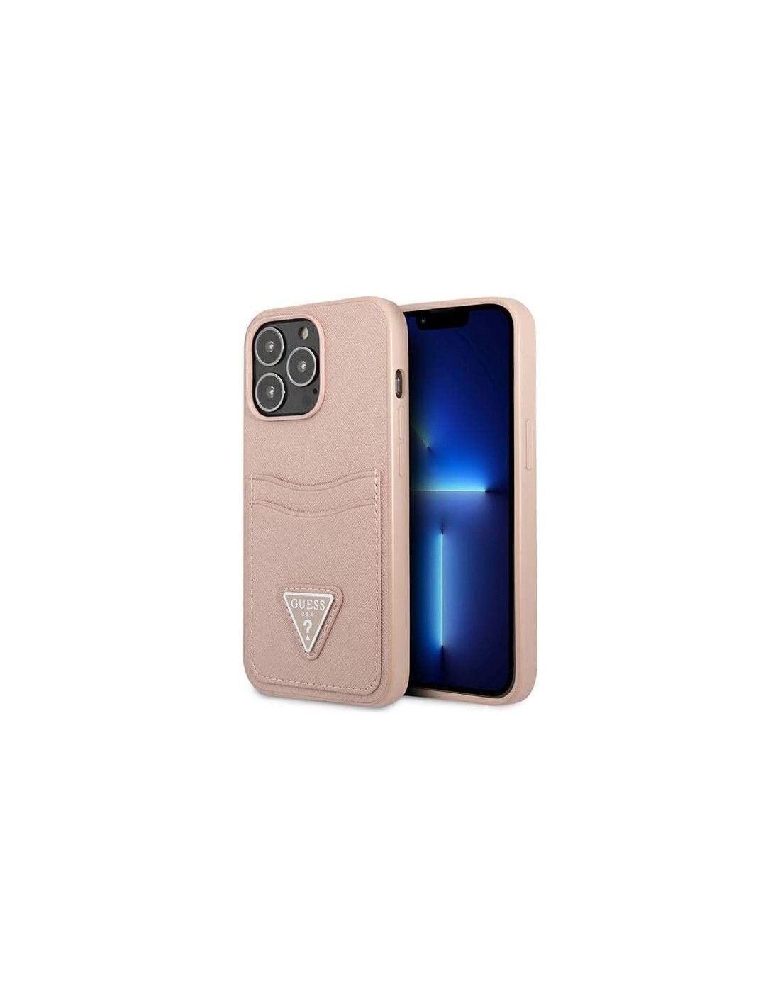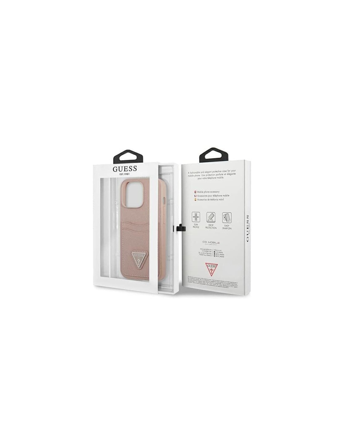 Funda Guess diseño Saffiano con tarjetero para Apple iPhone 13 Pro color Rosa. Diseño y elegancia para proteger tu iPhone 13 Pro de golpes y arañazos.