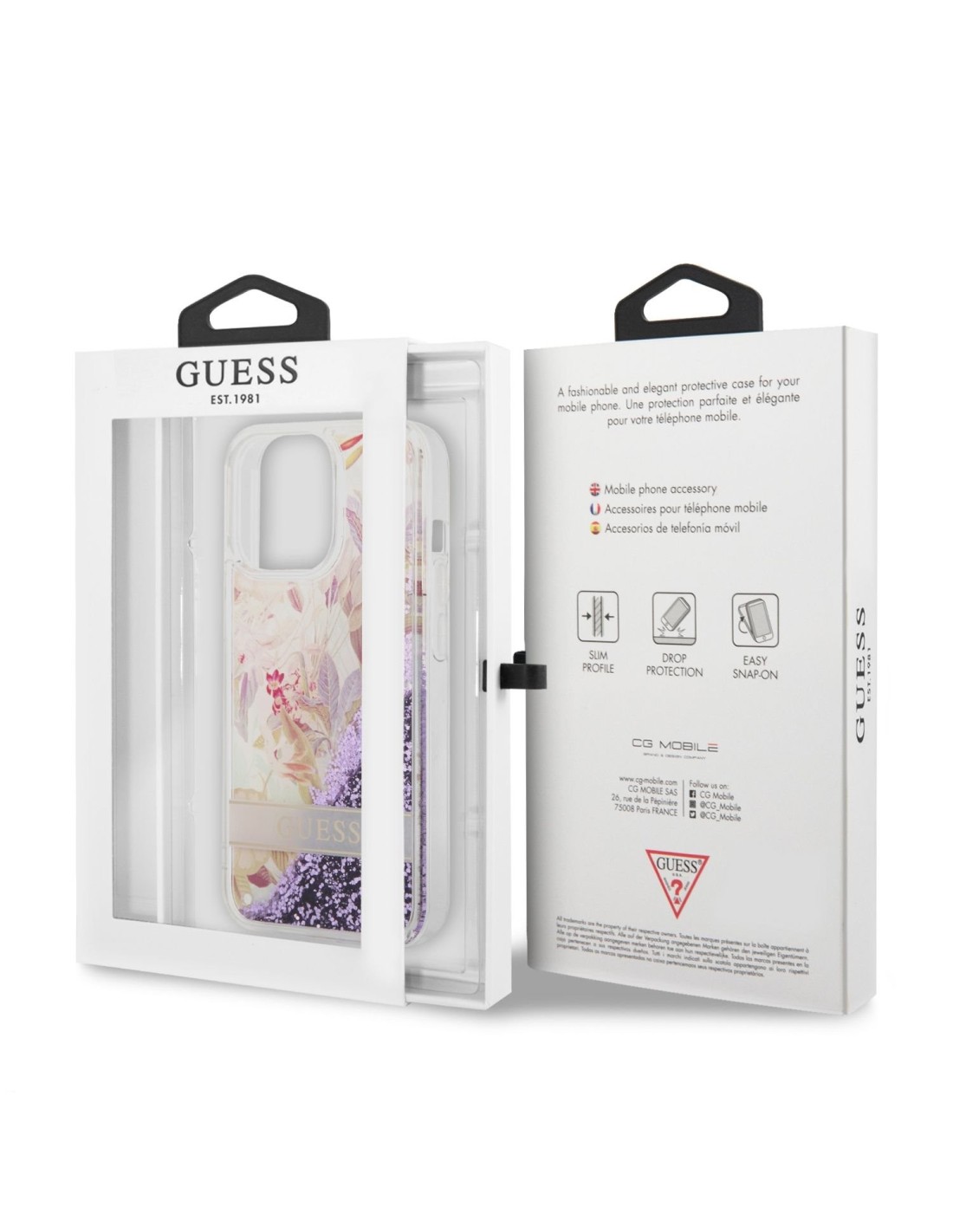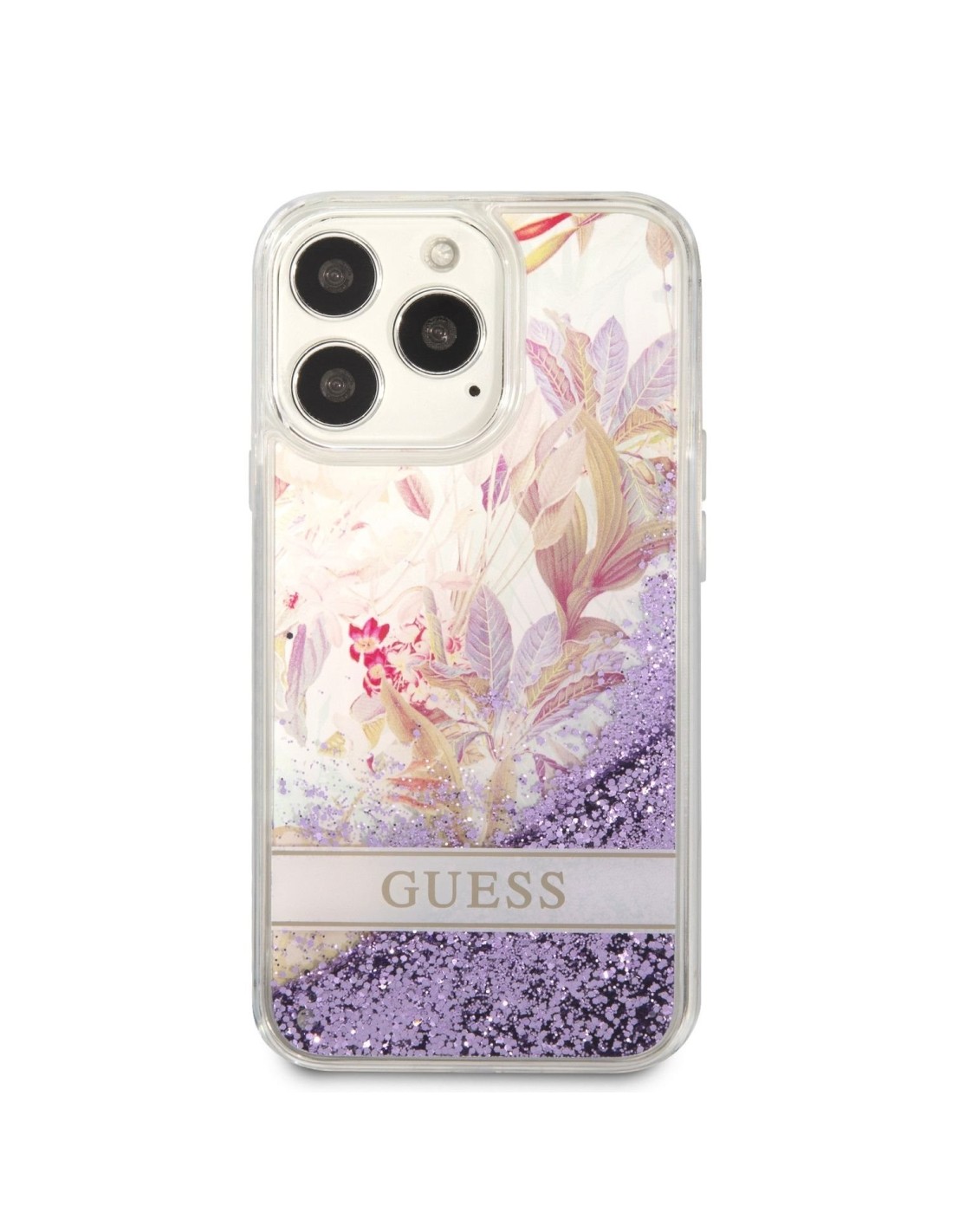 Funda de silicona de Guess con purpurina líquida para iPhone 13 Pro Max en color morado con flores. Diseño y elegancia para proteger tu iPhone 13 Pro Max de golpes y arañazos.