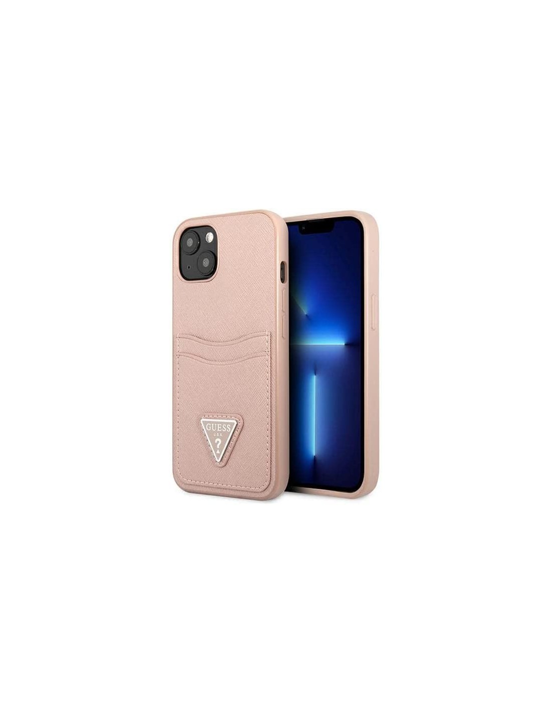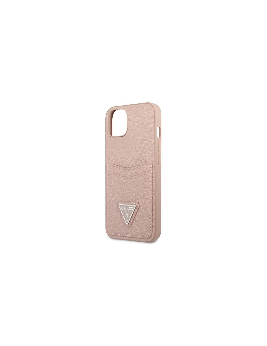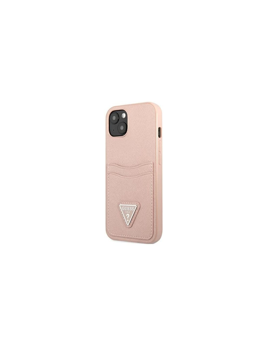 Funda Guess diseño Saffiano con tarjetero para Apple iPhone 13 color Rosa. Diseño y elegancia para proteger tu iPhone 13 de golpes y arañazos.