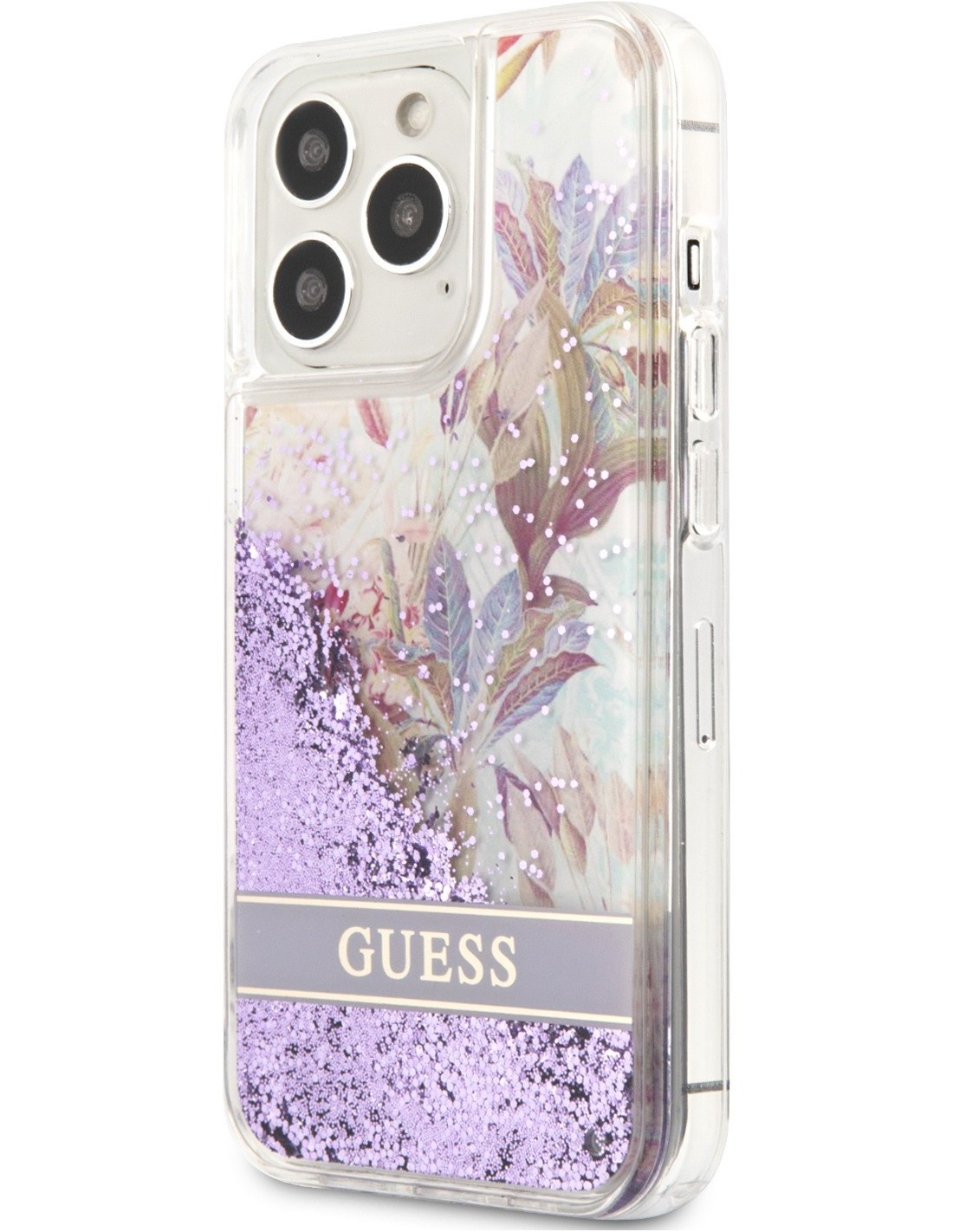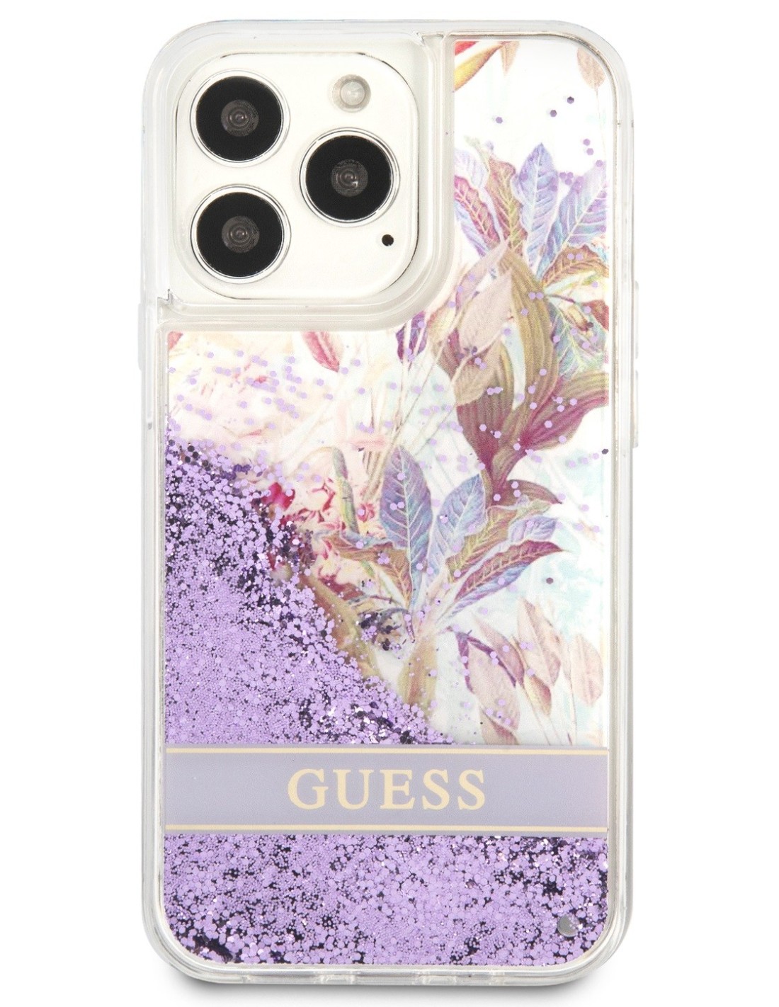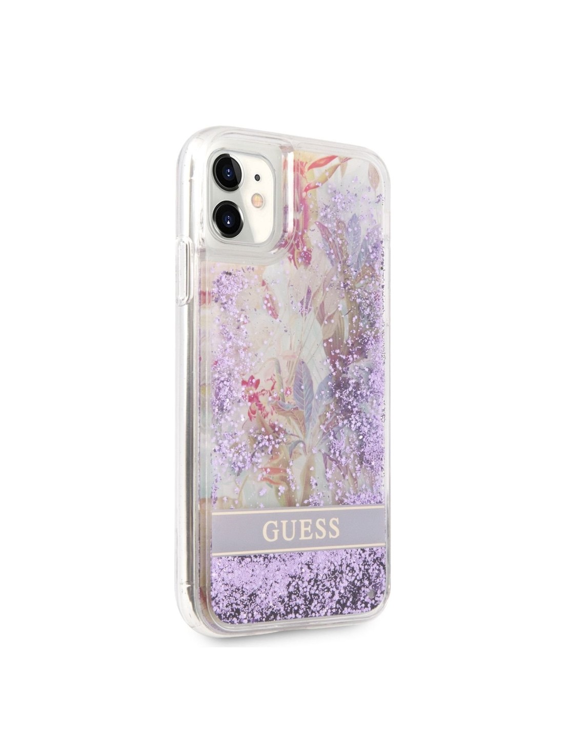Funda de silicona de Guess con purpurina líquida para iPhone 11 en color morado con flores. Diseño y elegancia para proteger tu iPhone 11 de golpes y arañazos.