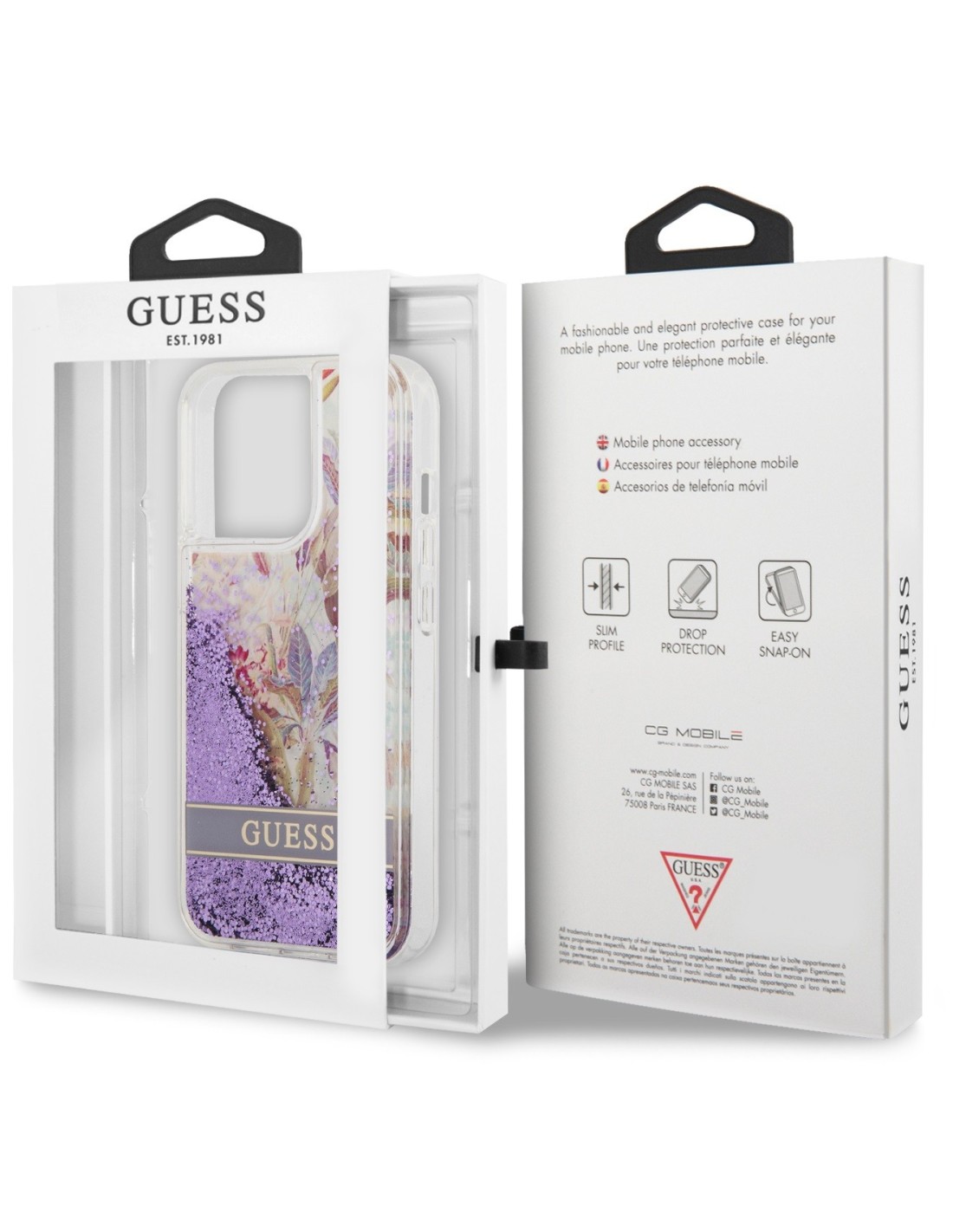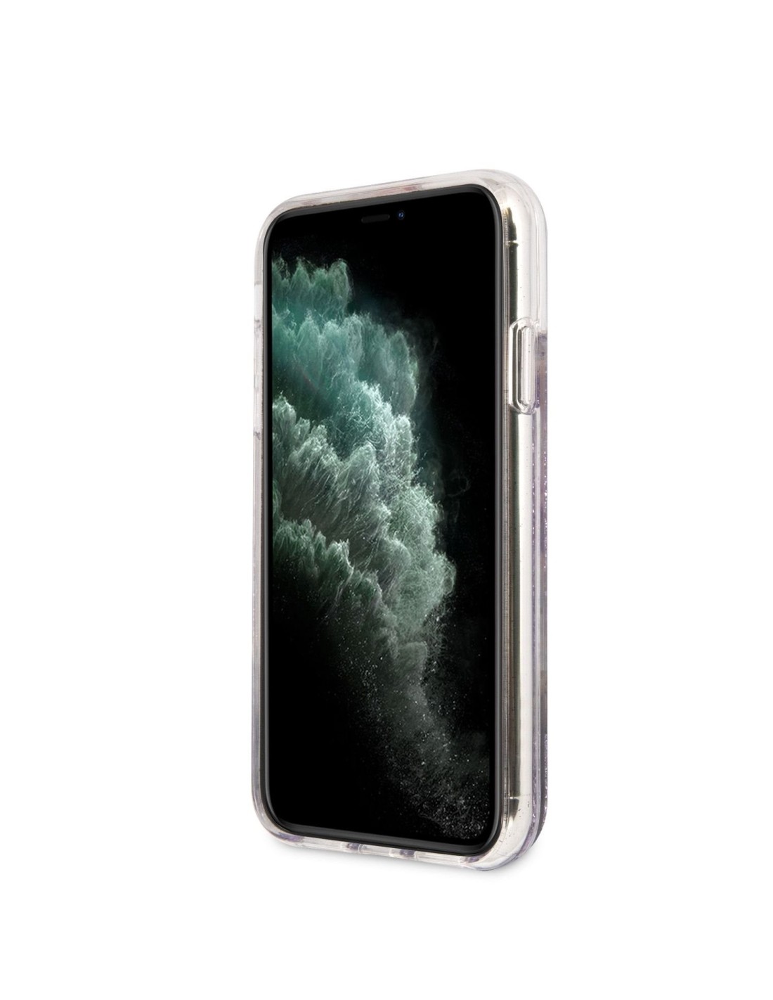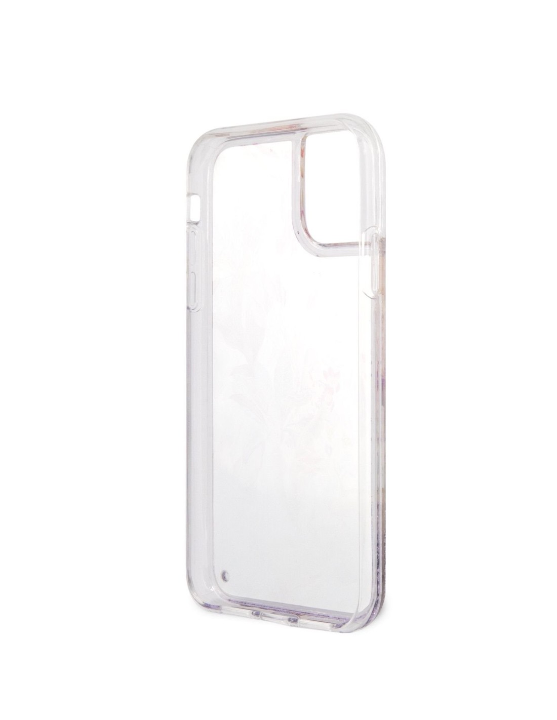 Funda de silicona de Guess con purpurina líquida para iPhone 11 en color morado con flores. Diseño y elegancia para proteger tu iPhone 11 de golpes y arañazos.