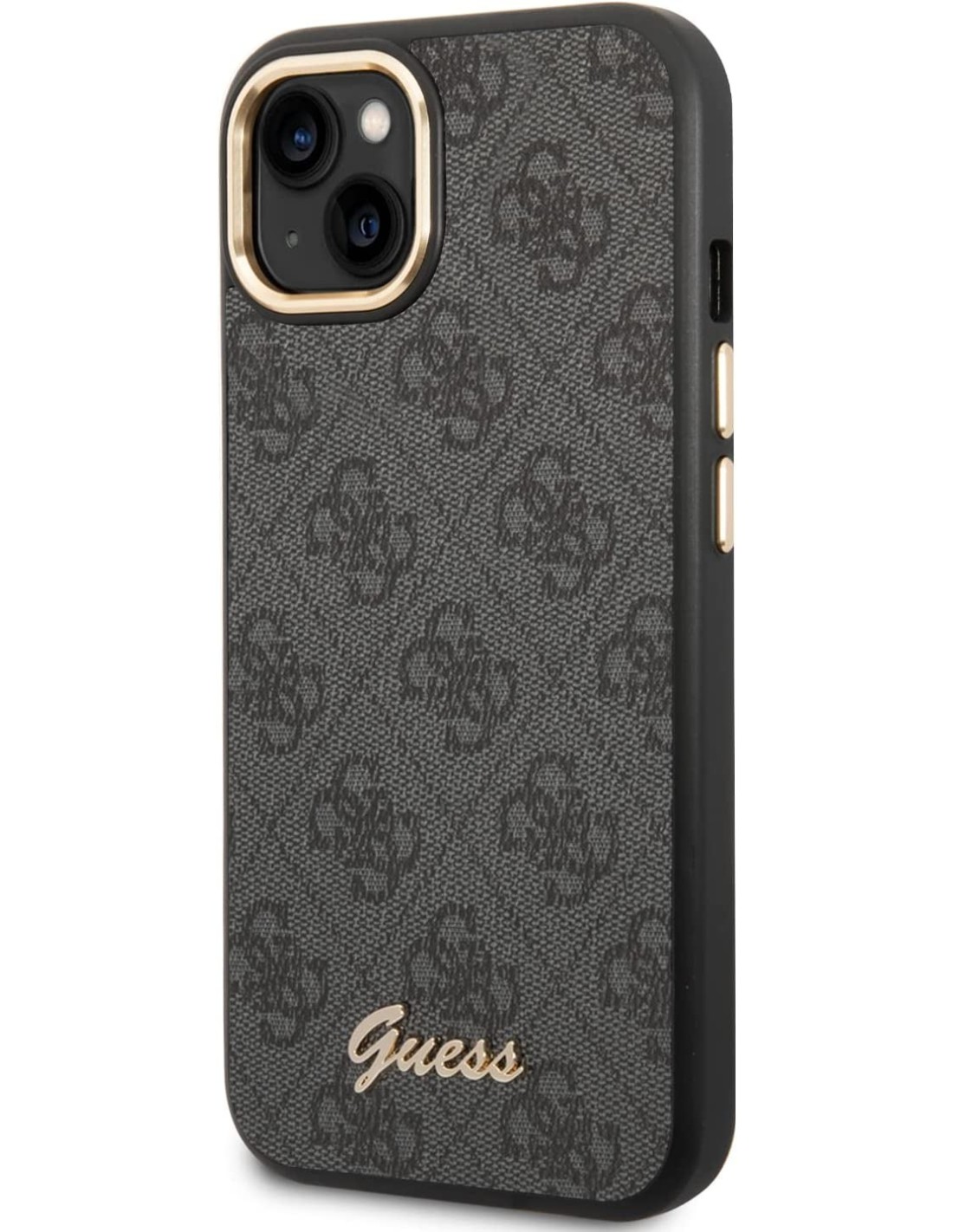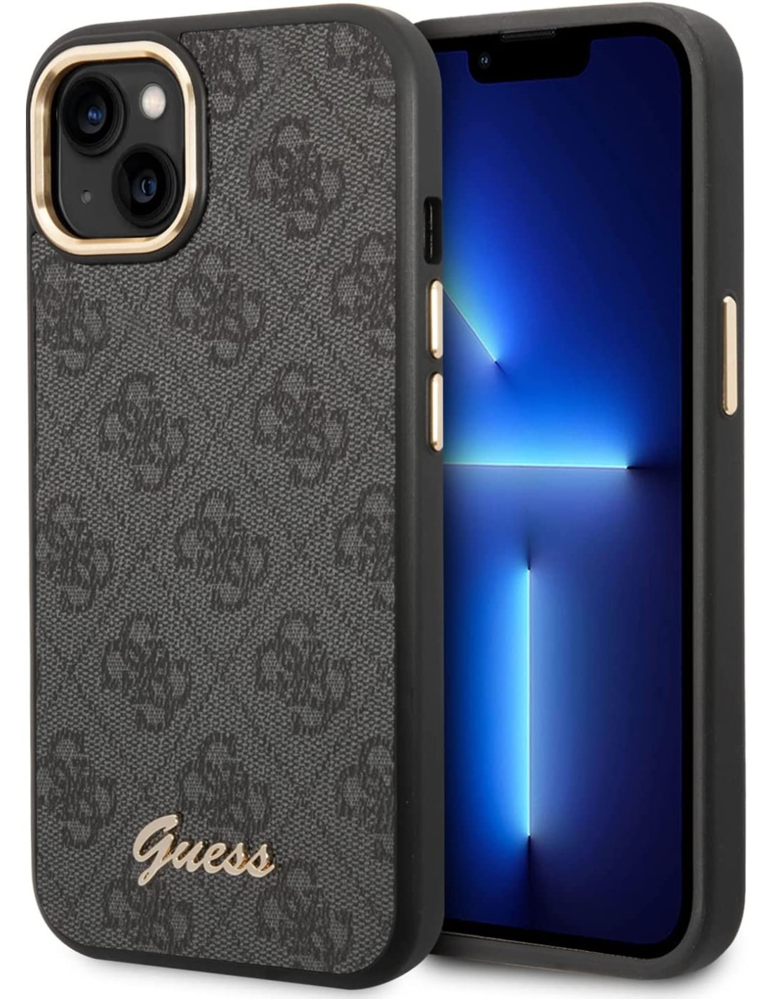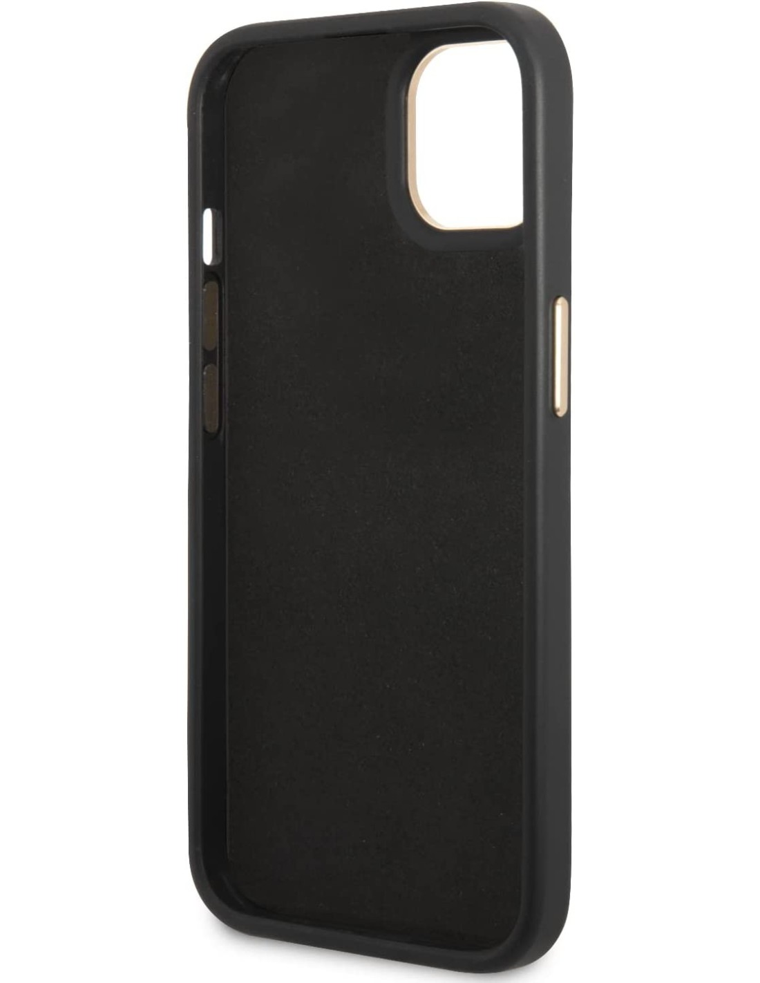 Fabricado en PU. Color negro, con borde de la cámara en dorado.