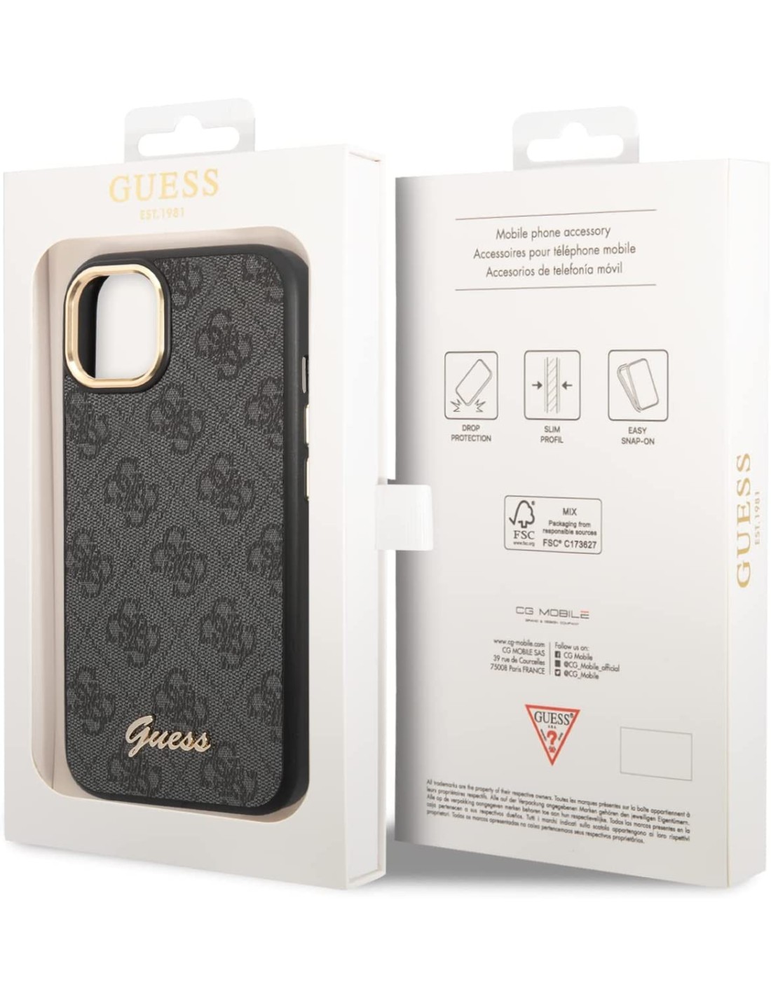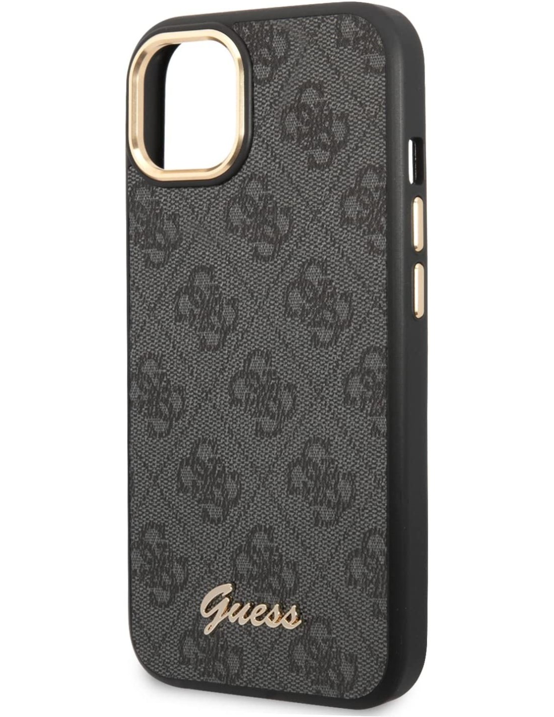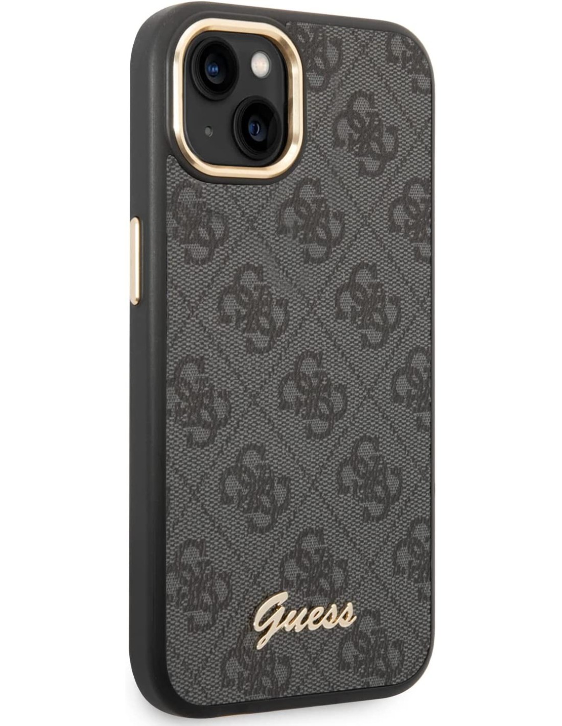Fabricado en PU. Color negro, con borde de la cámara en dorado.