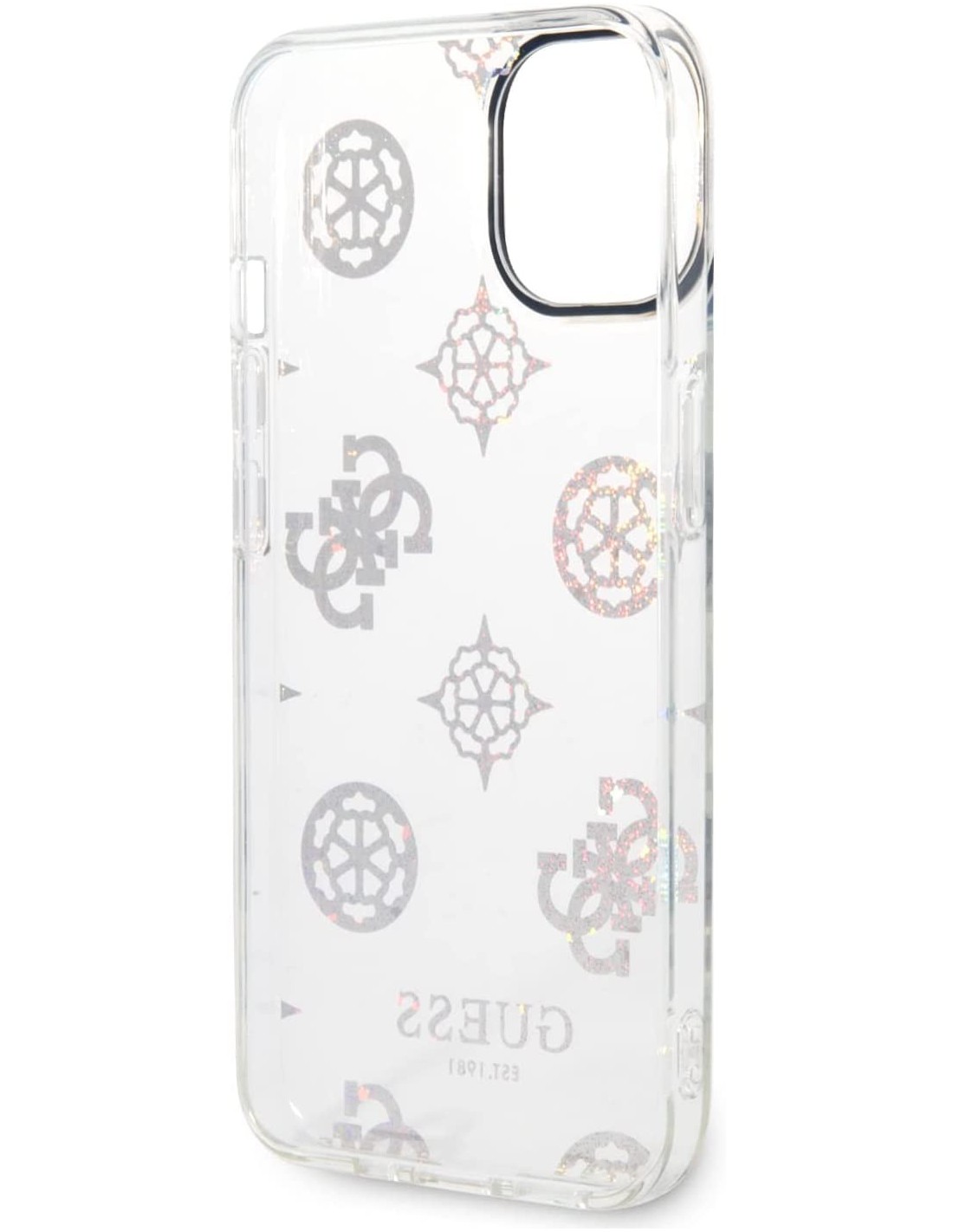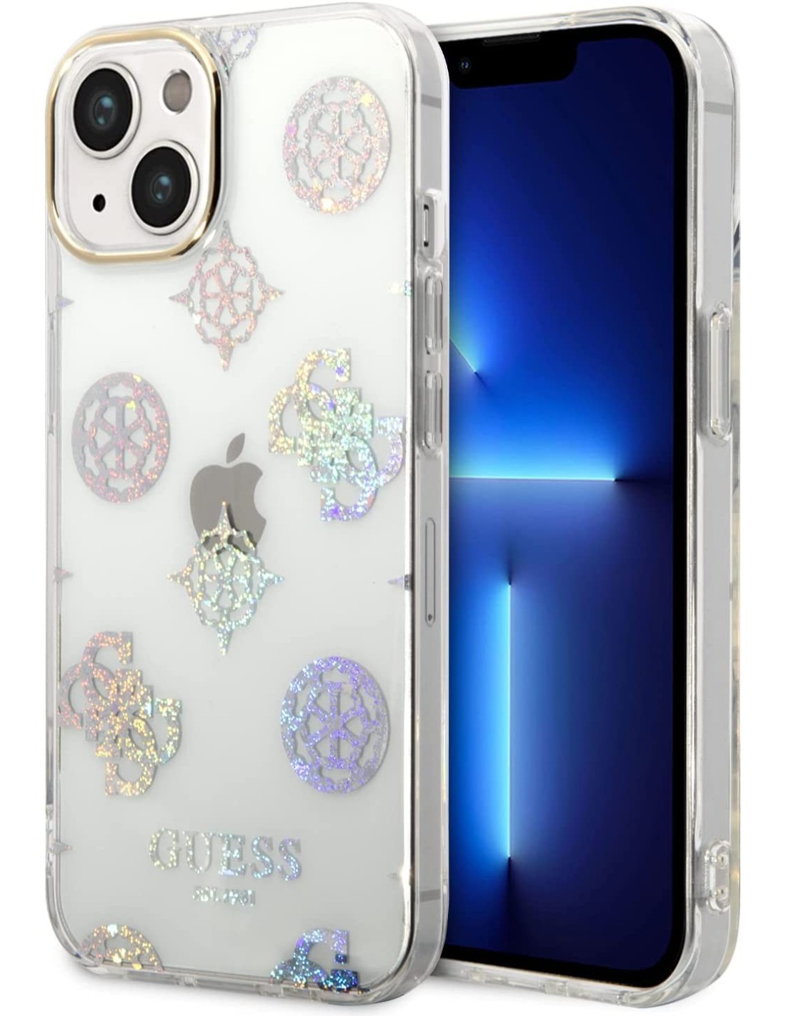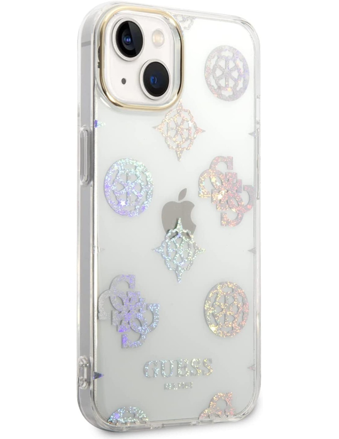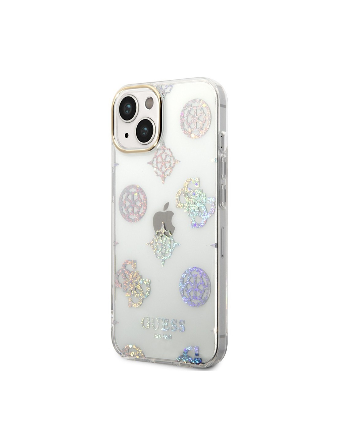Funda Guess Rígida Translúcida con Peonías Brillantes para Apple iPhone 14 Color Blanco. Diseño y elegancia para proteger tu iPhone 14 de golpes y arañazos.