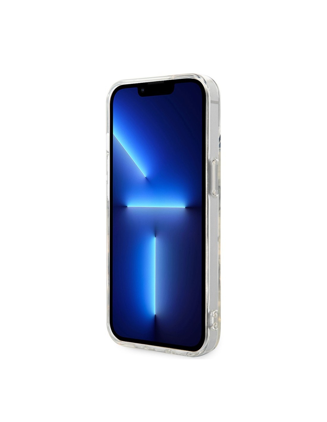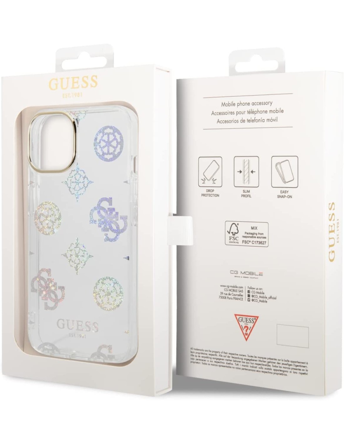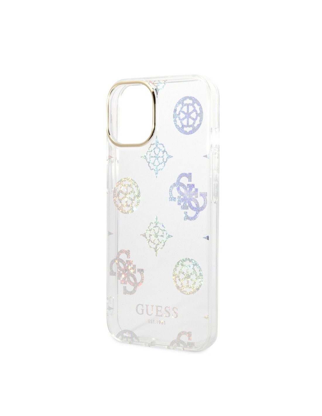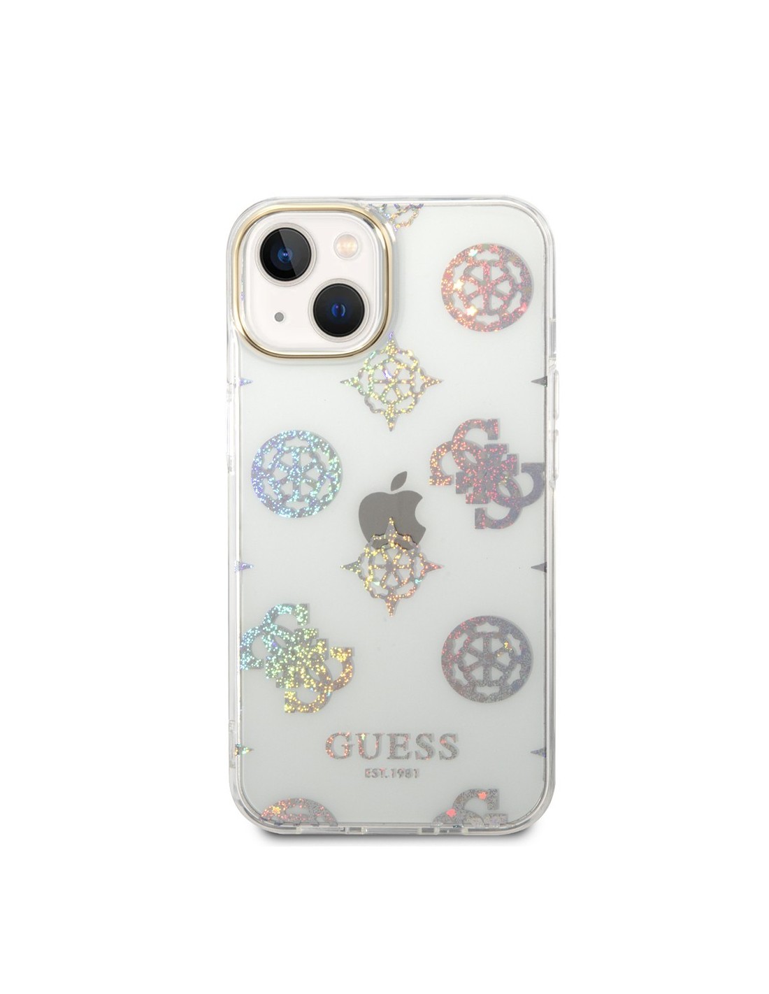 Funda Guess Rígida Translúcida con Peonías Brillantes para Apple iPhone 14 Color Blanco. Diseño y elegancia para proteger tu iPhone 14 de golpes y arañazos.