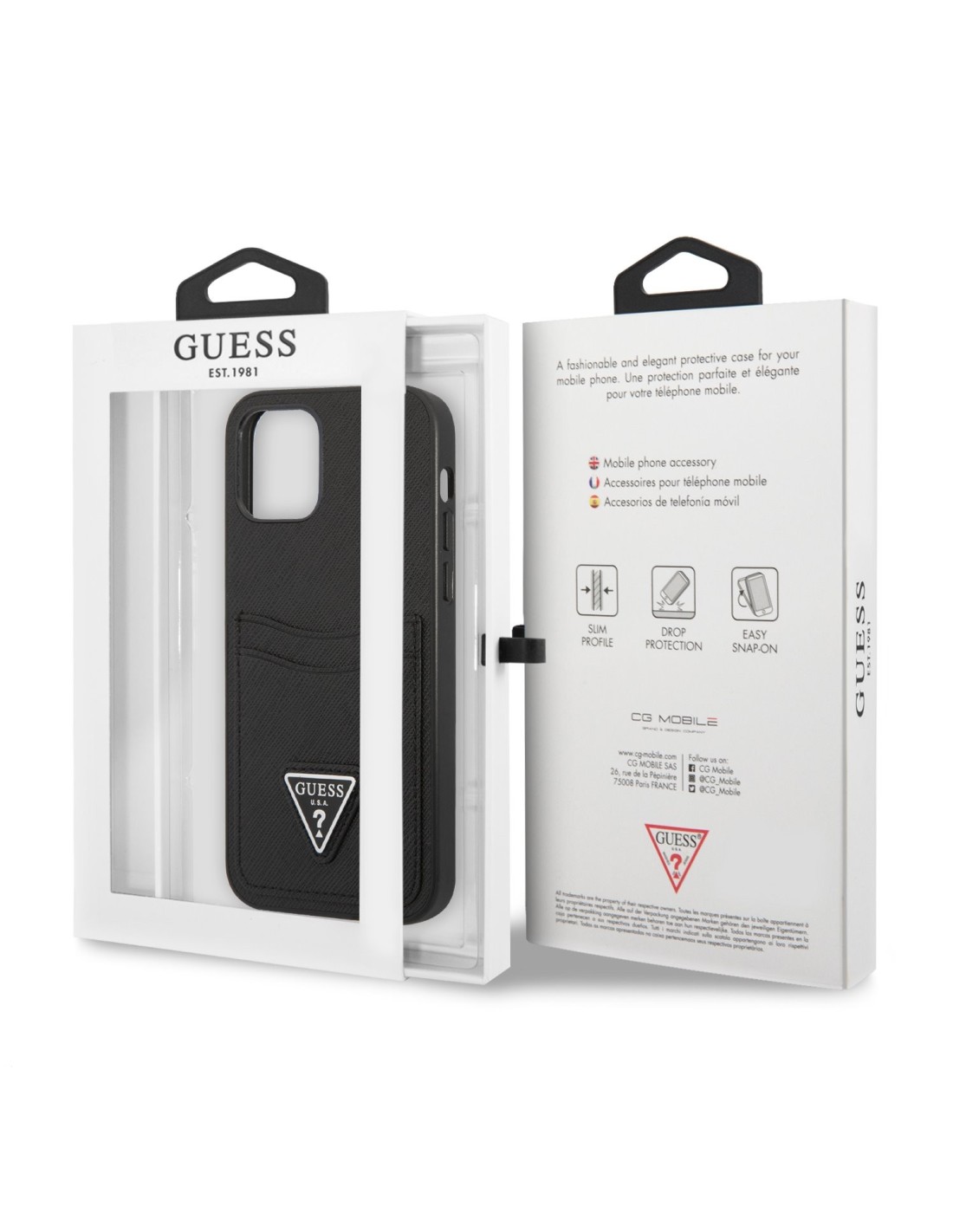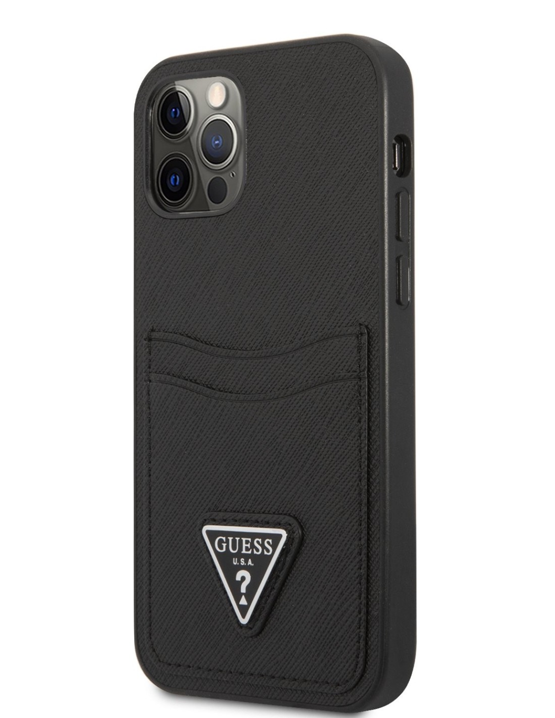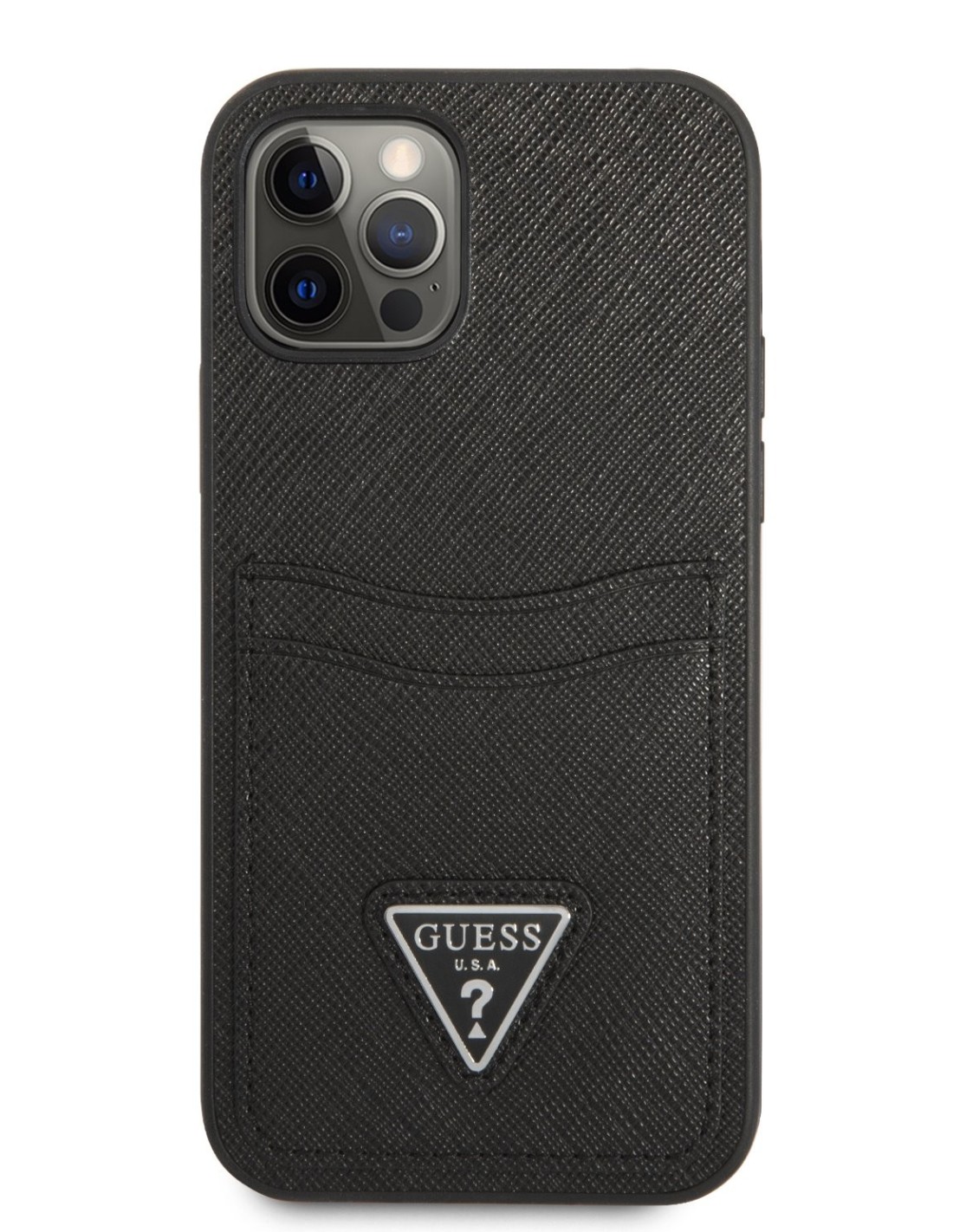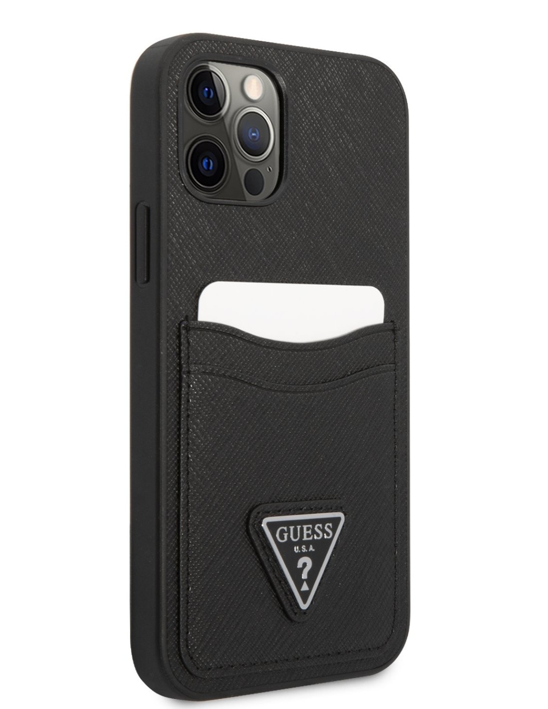 Funda Guess diseño Saffiano con tarjetero para Apple iPhone 12 | 12 Pro color Negro. Diseño y elegancia para proteger tu iPhone 12 | 12 Pro de golpes y arañazos.