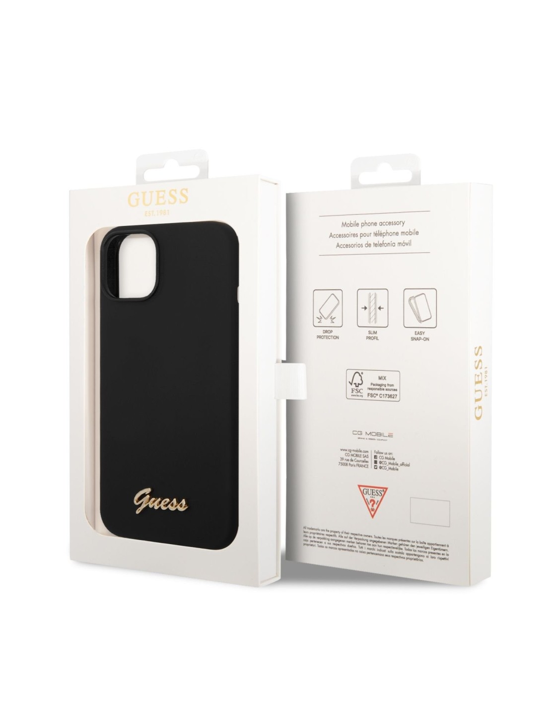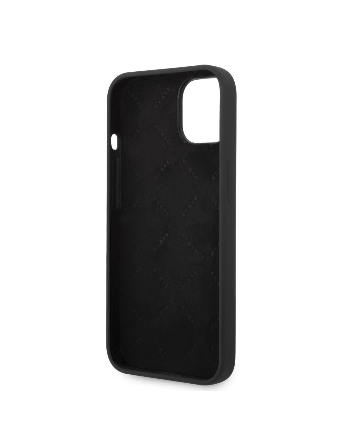 Funda Guess de Silicona para Apple iPhone 14 Plus Color Negro con logo dorado. Diseño y elegancia para proteger tu iPhone 14 Plus de golpes y arañazos.