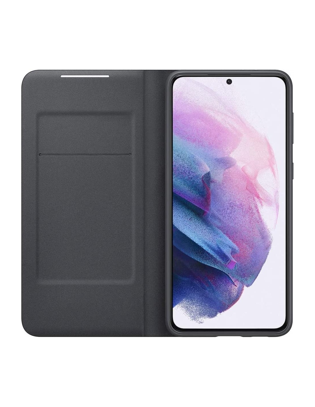 Funda LED original Samsung para Galaxy S21 Plus. Con un revestimiento que imita el cuero, esta funda moderna protege a la vez que muestra la hora y permite personalizar los iconos. Incluye ranura para tarjetas o algo de dinero.