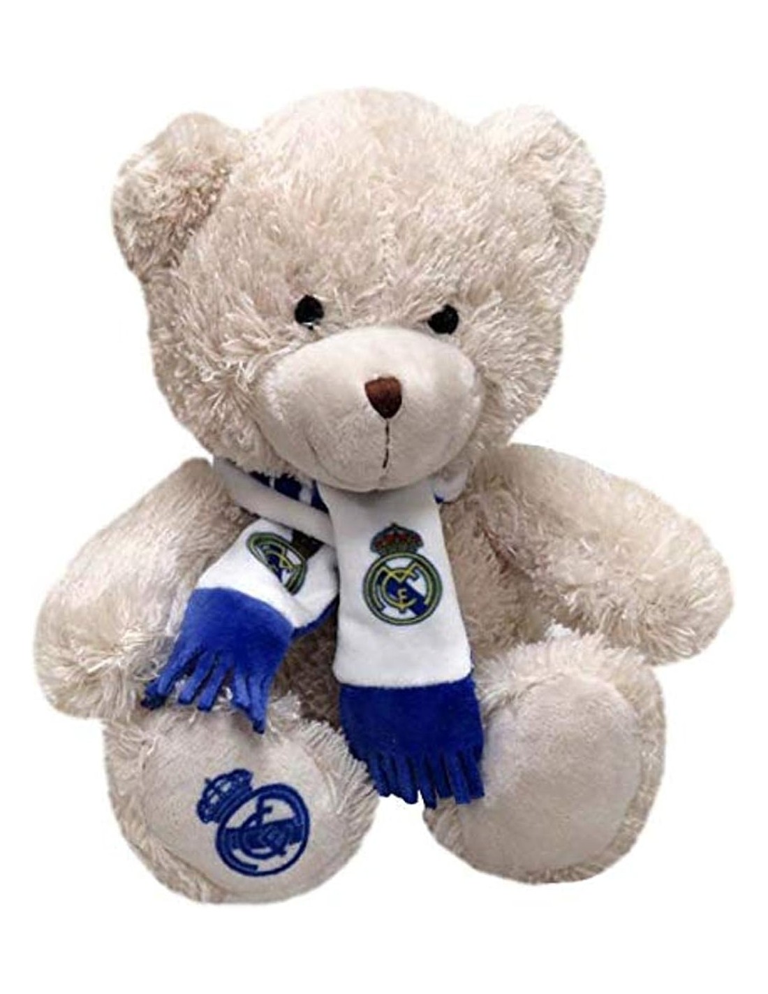 Peluche de osito Teddy con bufanda del Real Madrid, de 20 cm, ideal para demostrar el amor por el club blanco con un toque tierno y clásico.