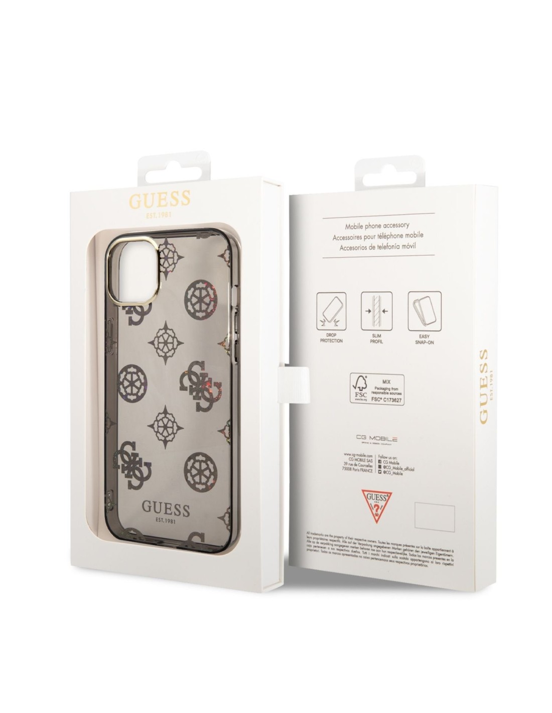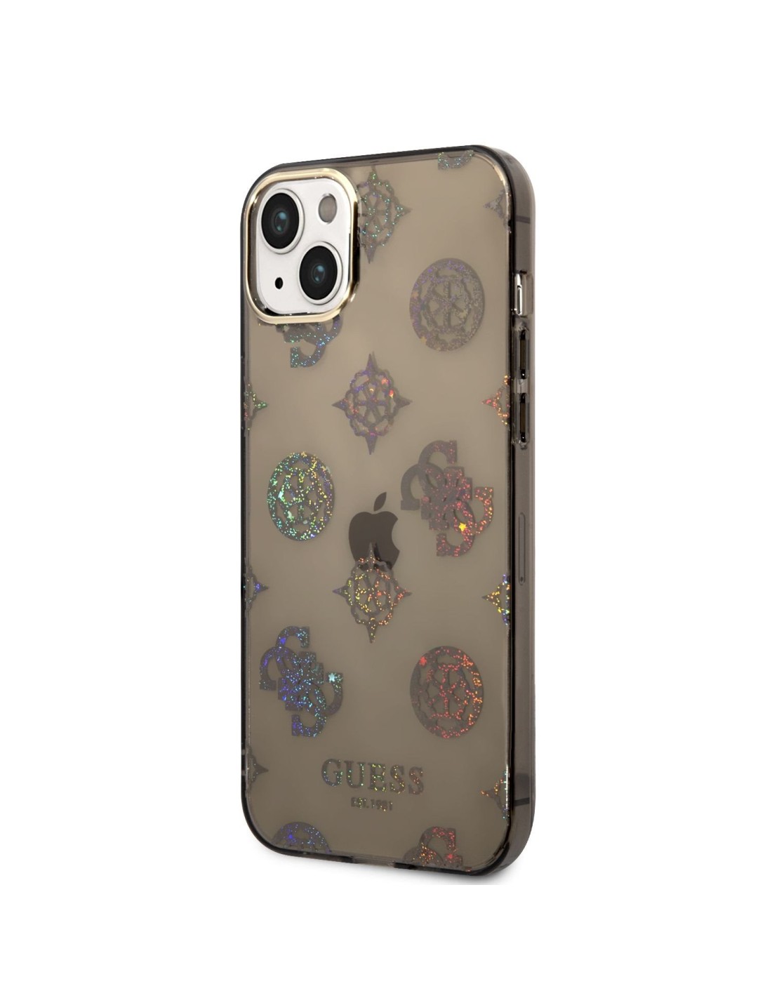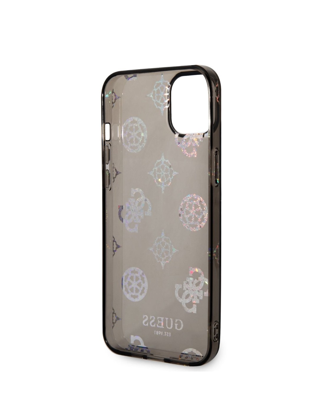 Funda Guess Rígida Translúcida con Peonías Brillantes para Apple iPhone 14 Plus Color Negro. Diseño y elegancia para proteger tu iPhone 14 Plus de golpes y arañazos.