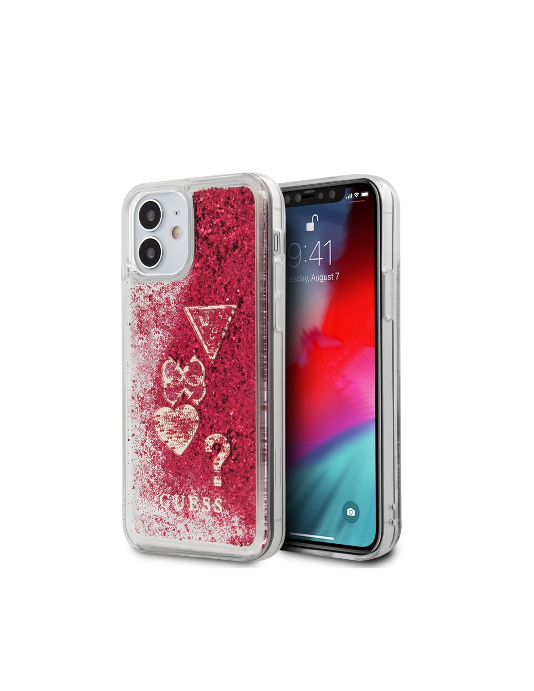 Funda Vintage de silicona de Guess con purpurina líquida para iPhone 12 Mini en color frambuesa con letras en dorado. Diseño y elegancia para proteger tu iPhone 12 Mini de golpes y arañazos.