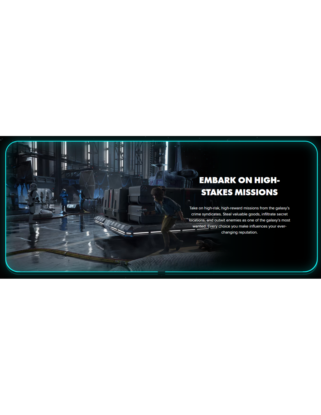 En Star Wars™ Outlaws, asumes el papel de una nueva y audaz protagonista, Kay Vess, una contrabandista que se abre camino a través de la galaxia en busca de libertad y fortuna. Acompañada por su leal compañero Nix, Kay se enfrenta a desafíos peligrosos y enemigos poderosos, incluidos los despiadados señores del crimen y las implacables fuerzas del Imperio.