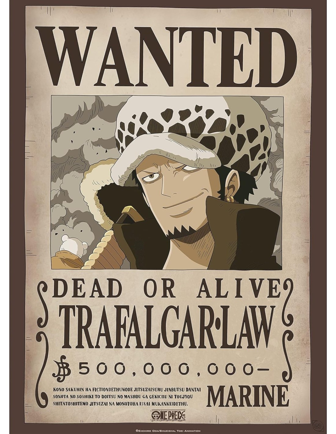 El póster Chibi Abystyle One Piece Modelo Wanted Law es una pieza imprescindible para los seguidores de la popular serie de anime y manga One Piece. Este póster presenta una encantadora ilustración en estilo chibi de Trafalgar D. Water Law, el astuto y carismático capitán de los Piratas del Corazón, en un diseño que imita un cartel de "Se Busca".