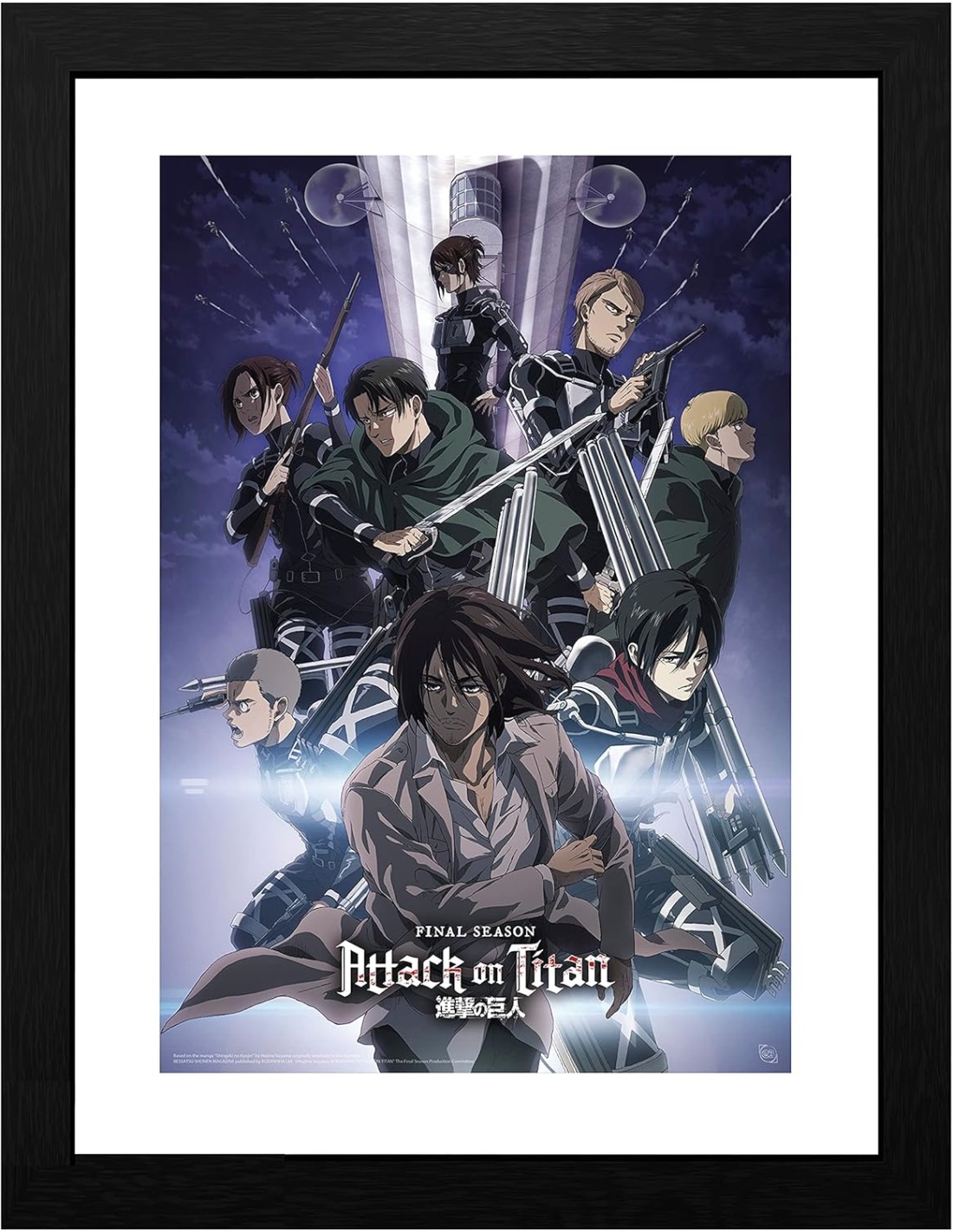 Este póster enmarcado de Abystyle presenta una épica ilustración de Attack on Titan: The Final Season, con los personajes principales en su última misión contra los titanes. El diseño incluye a Eren, Mikasa, Armin, Levi y el resto del escuadrón, todos preparados para el combate, con una puesta en escena poderosa y oscura.