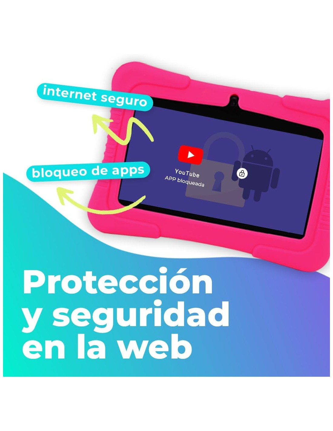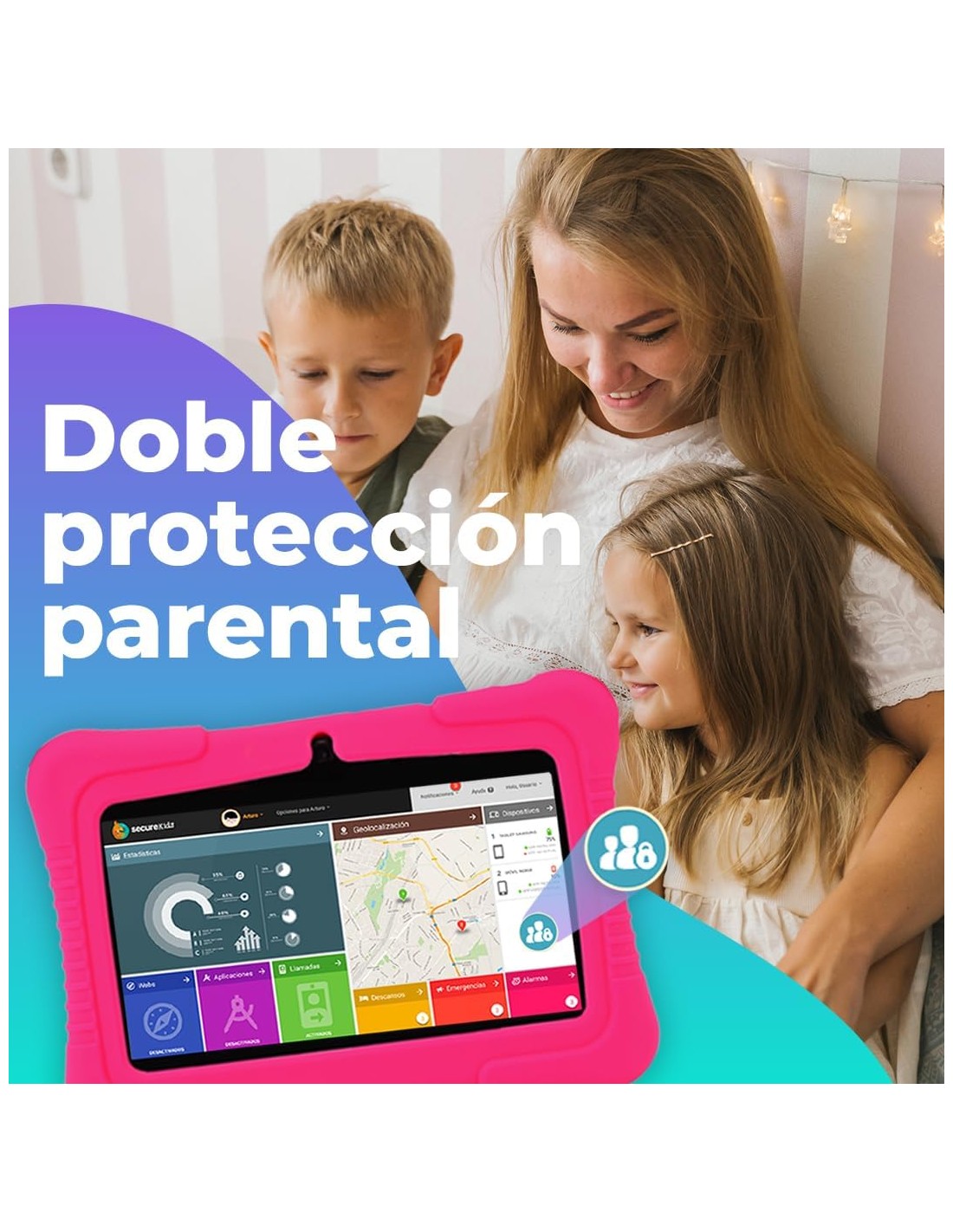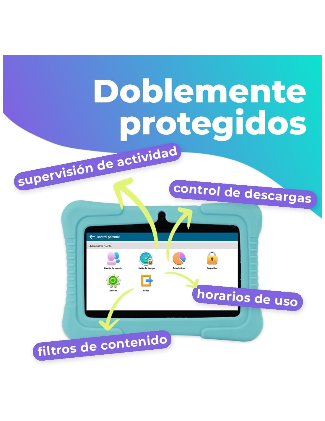 - Doble control parental: La seguridad nuestros peques es lo más importante por eso la Tablet kids incorpora un doble sistema de control parental con que el que podrás establecer horarios de uso, conocer estadísticas, crear filtros de aplicaciones y Web.