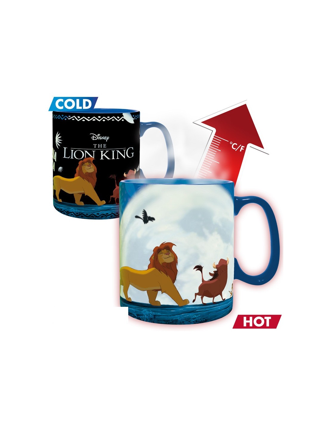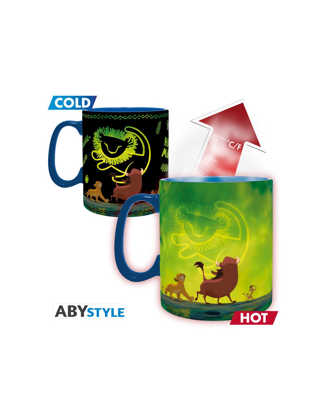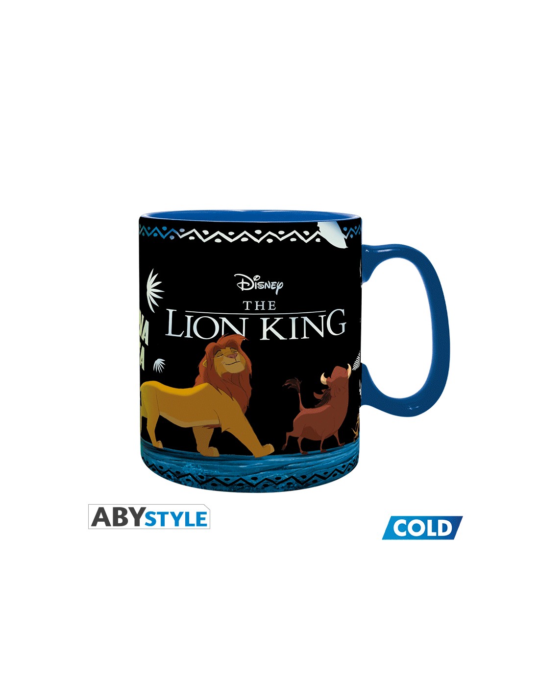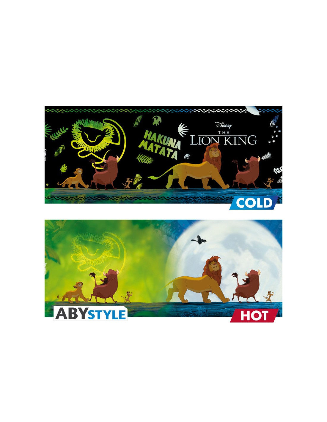 Revive la magia del reino animal con esta taza térmica de cerámica de El Rey León, diseñada por Abystyle. A temperatura ambiente, la taza presenta un diseño sobrio con siluetas icónicas. Pero al verter tu bebida caliente favorita, el paisaje de la sabana africana cobra vida y revela una ilustración vibrante con Simba, Timón y Pumba cruzando al ritmo de “Hakuna Matata”.