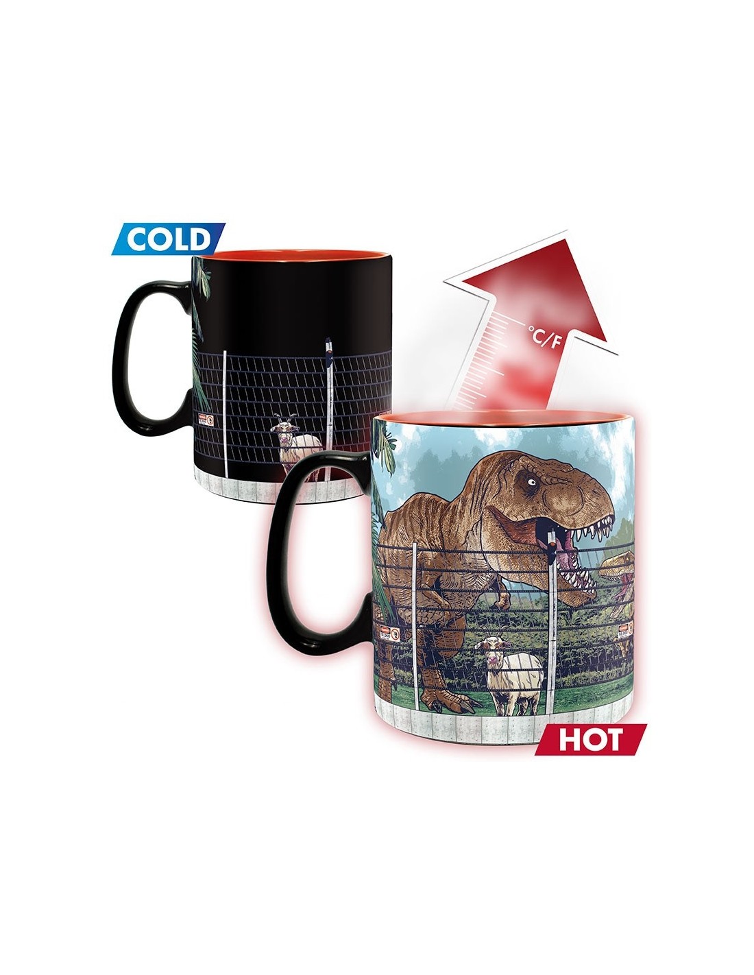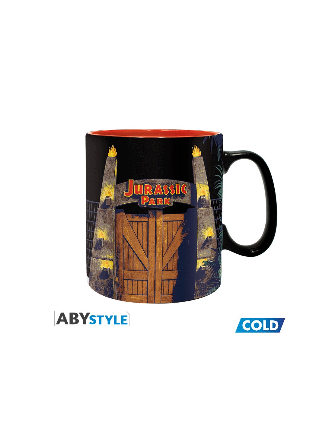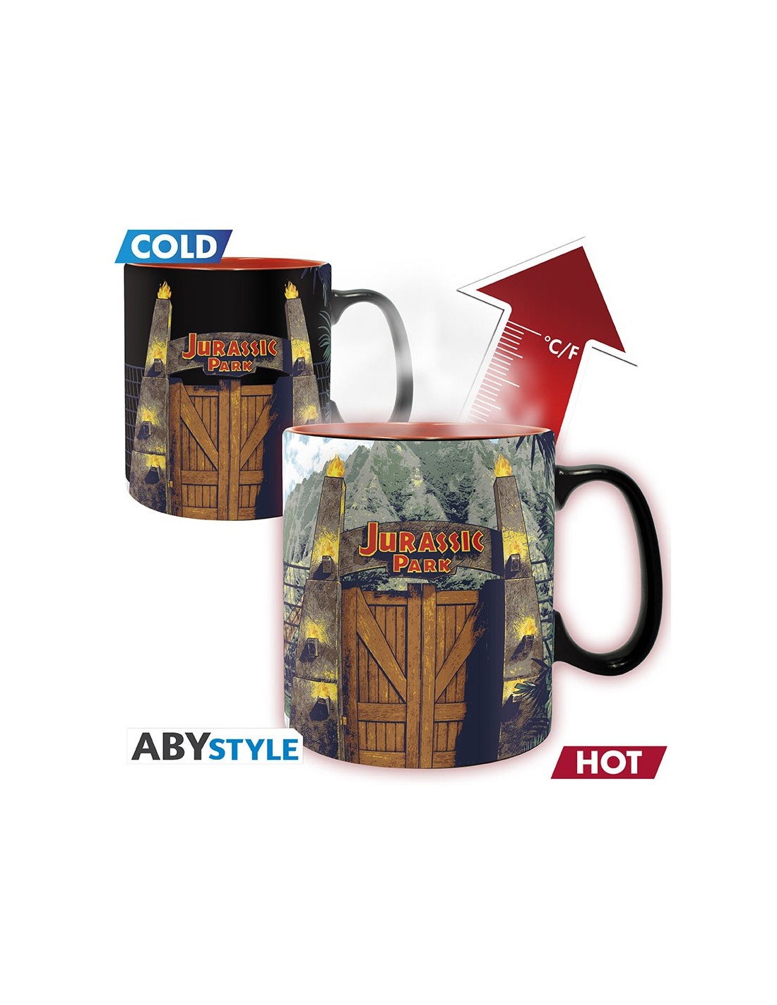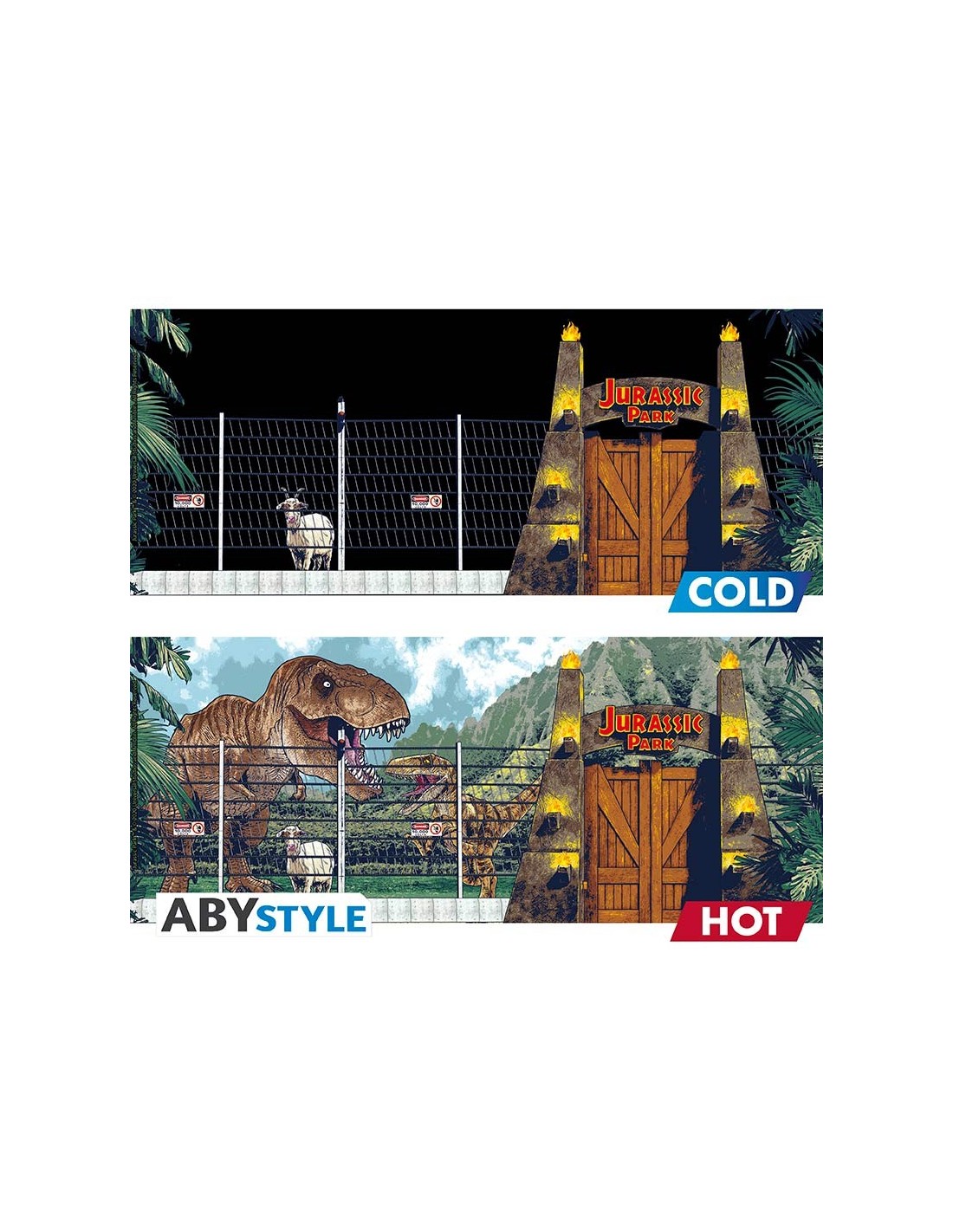 Revive la emoción de la primera visita a Jurassic Park cada mañana con esta espectacular taza térmica de cerámica de Abystyle. Su diseño muestra el icónico portón de entrada al parque, y al verter una bebida caliente, la imagen cobra vida revelando un fondo iluminado y selvático que captura toda la magia y peligro del mundo jurásico.