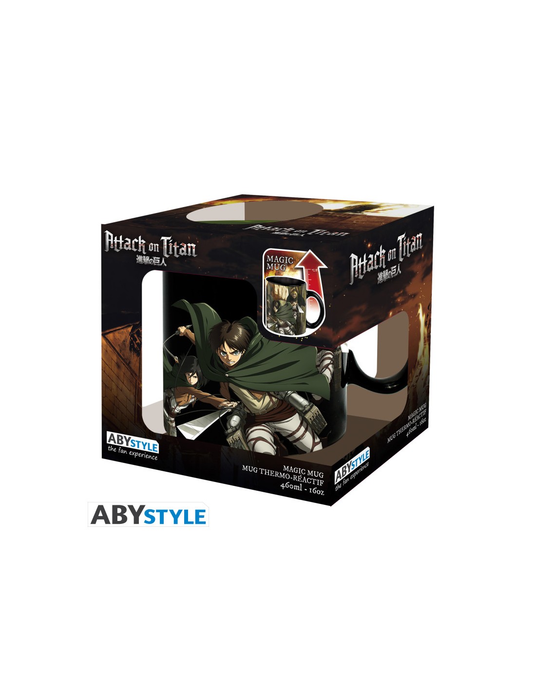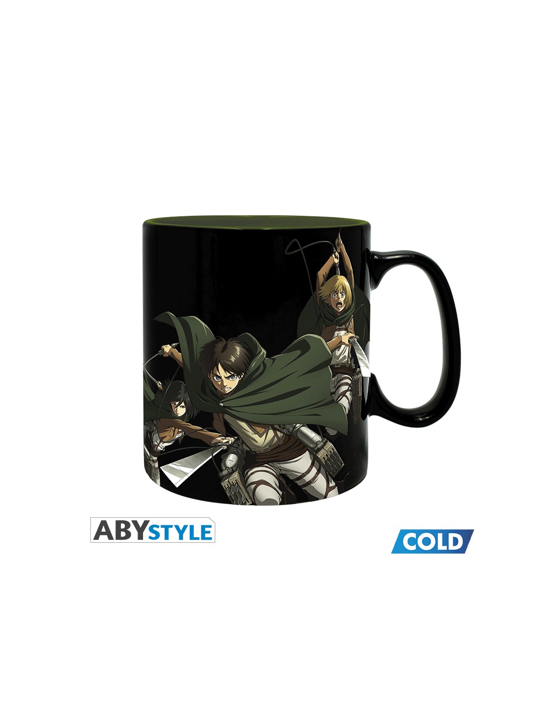 La taza térmica de 460ml (aproximadamente 15.5 oz) de Abystyle es un artículo interactivo que celebra la intensidad y el misterio de Attack on Titan (Shingeki no Kyojin). Fabricada en cerámica de alta calidad, el diseño de la taza utiliza tinta termosensible que reacciona al calor. Cuando la taza está fría, la superficie es predominantemente negra y solo muestra un diseño discreto con los miembros de la Legión de Reconocimiento (Eren, Mikasa y Armin) en plena acción con su Equipo de Maniobra Tridimensional.