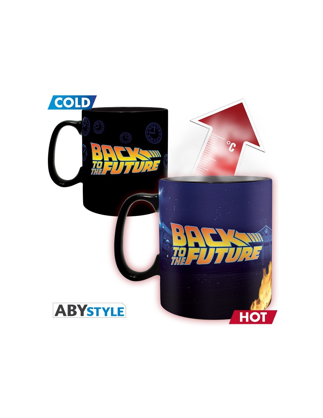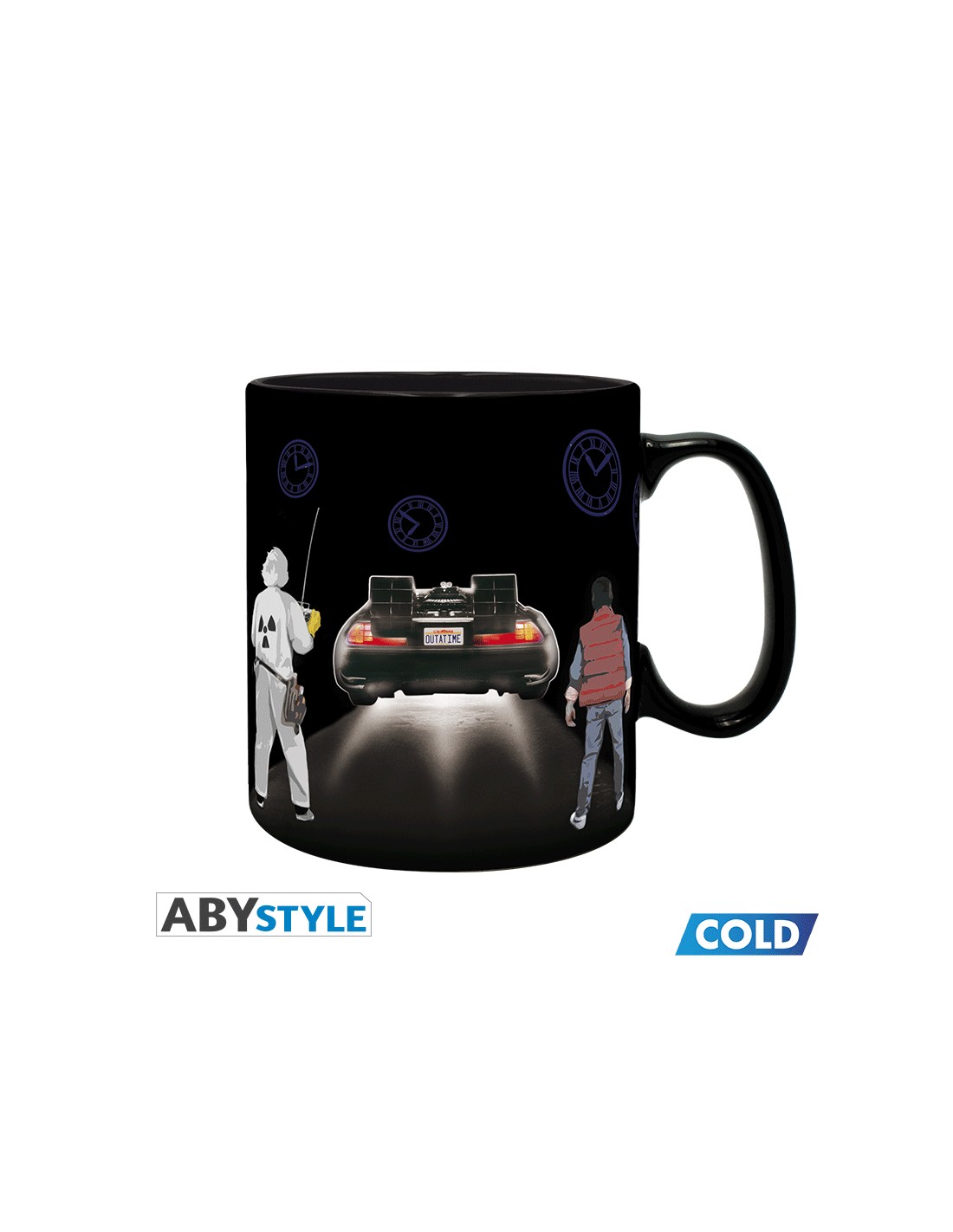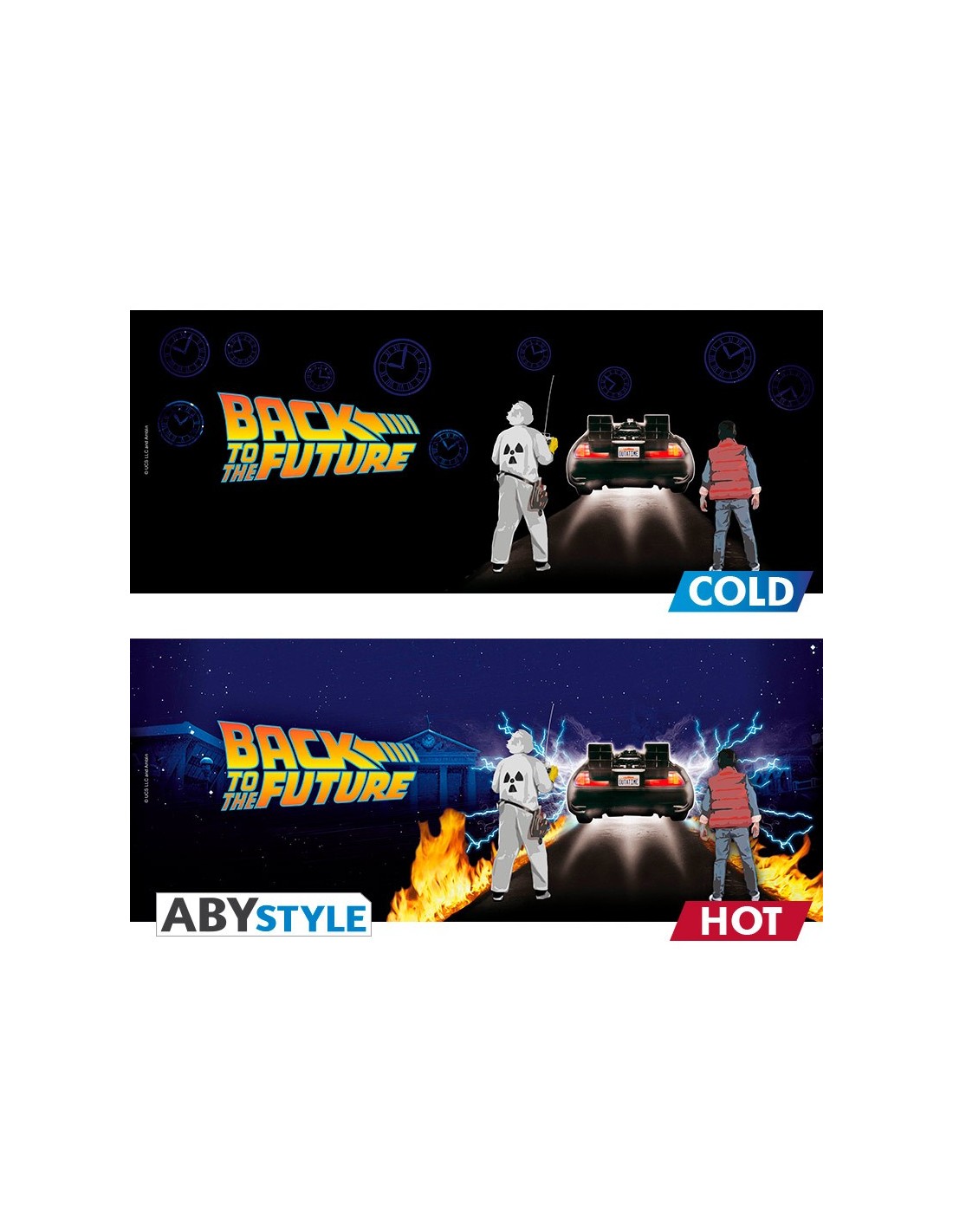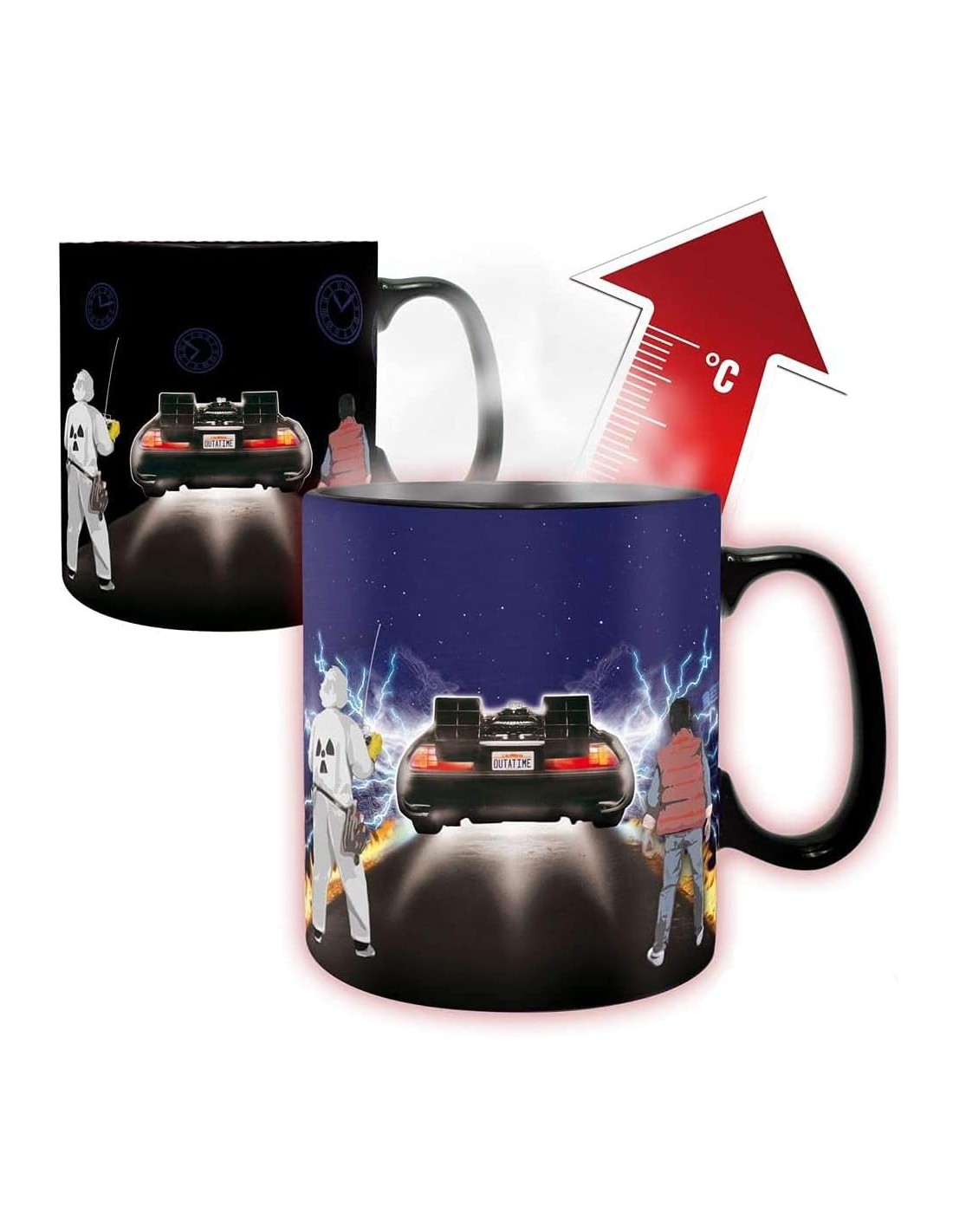 La taza térmica de 46 cl (aproximadamente 15.5 oz) de Abystyle es un recipiente interactivo que captura el momento más memorable de la trilogía de ciencia ficción. Fabricada en cerámica de alta calidad, el diseño utiliza tinta termosensible que reacciona a los cambios de temperatura. Cuando la taza está fría, la superficie es de color negro profundo, mostrando de manera discreta al DeLorean, Marty y Doc.