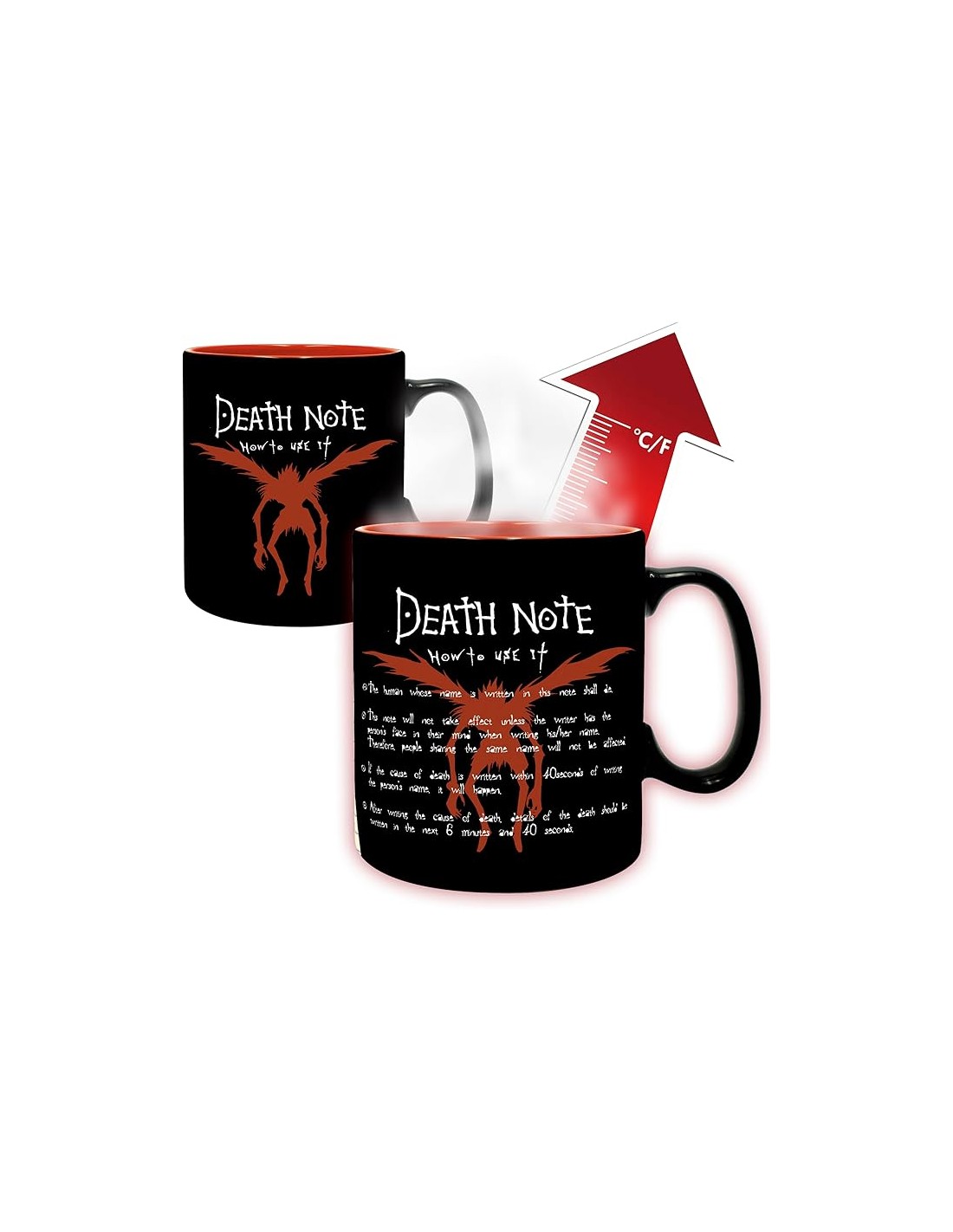 La transformación visual es espectacular: se revela la figura del Shinigami Ryuk en tonos rojizos, que se cierne bajo el logo del título DEATH NOTE: How to Use It. Lo más destacado son las primeras reglas de uso de la Death Note escritas a continuación, que establecen las escalofriantes condiciones para matar. El diseño interior, a menudo de color rojo intenso o carmesí, añade un toque dramático que refuerza el tema oscuro de la serie. Esta taza es un excelente objeto de colección que permite a los fans sumergirse en la premisa del manga con cada sorbo.