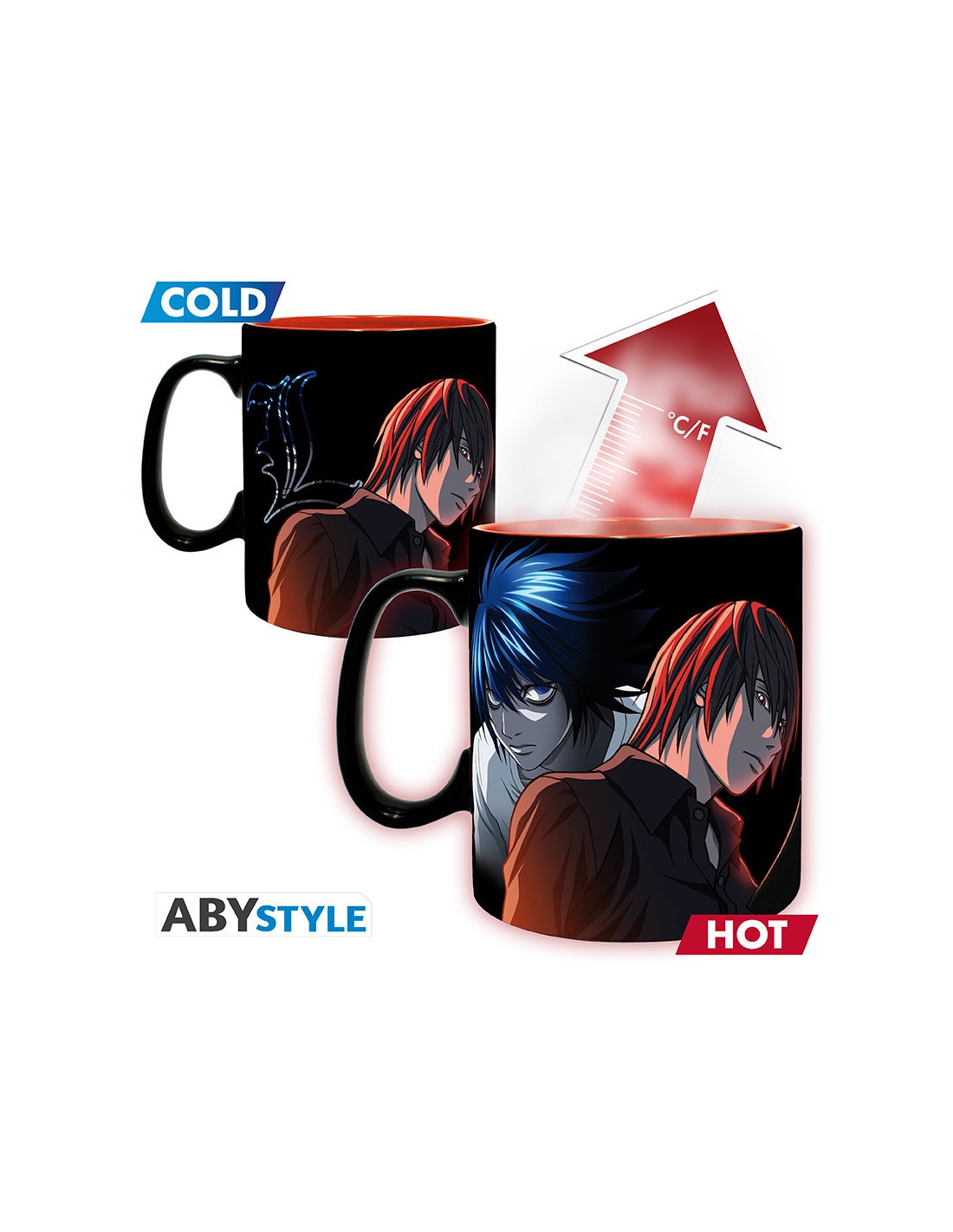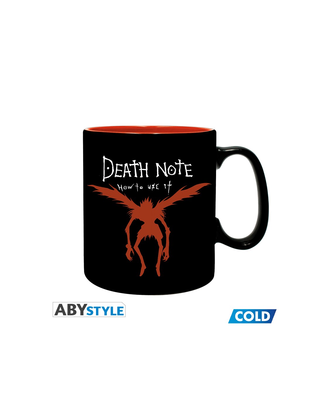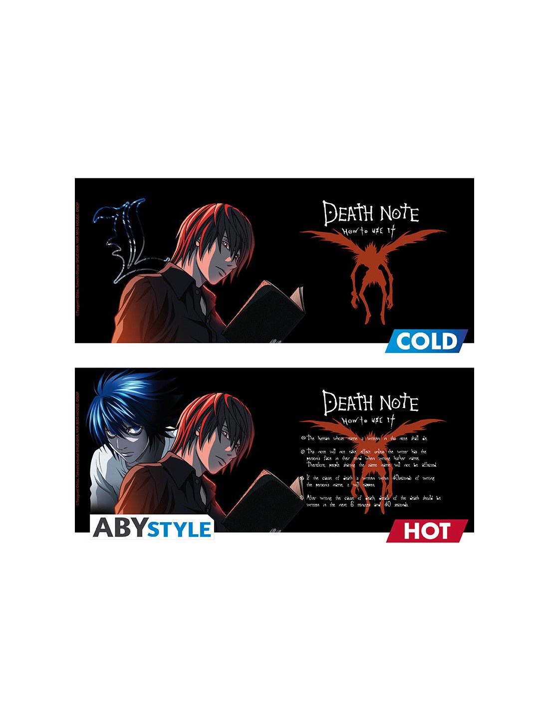 La taza térmica de 46 cl (aproximadamente 15.5 oz) de Abystyle es un recipiente funcional que celebra la mitología de Death Note. Fabricada en cerámica de alta calidad, el diseño de la taza utiliza tinta termosensible que reacciona a la temperatura. Cuando la taza está fría, la superficie es de color negro mate, y solo muestra de forma sutil elementos de la serie. Al verter una bebida caliente, el calor activa la tinta, revelando el diseño completo.