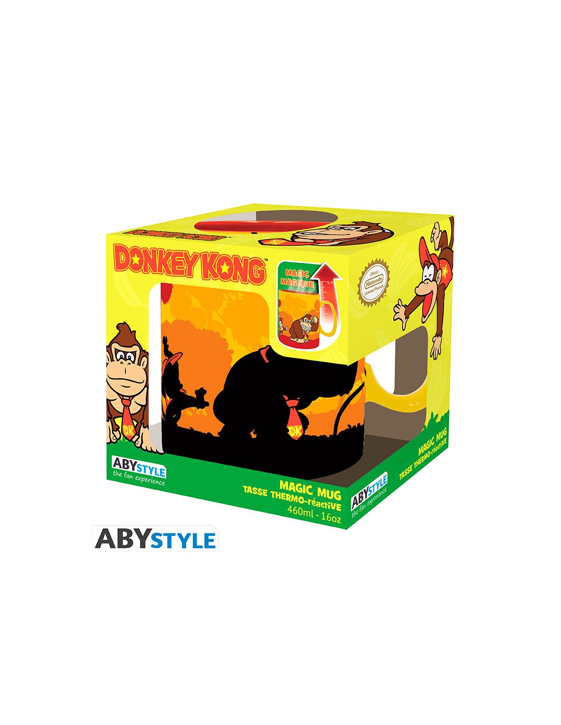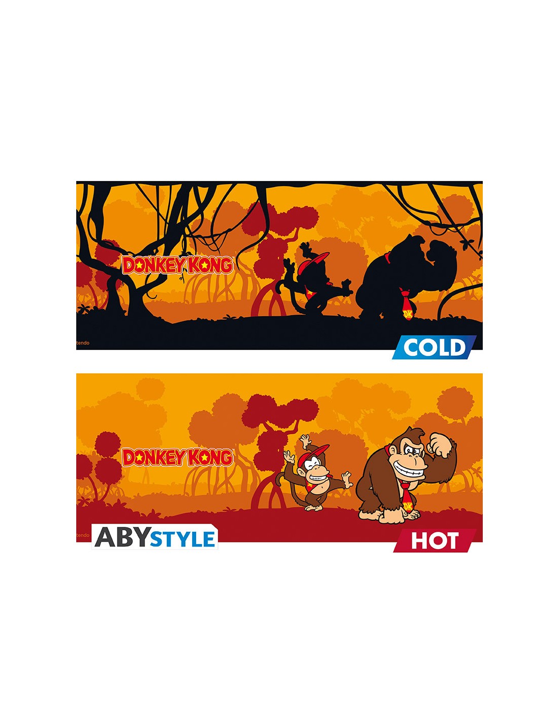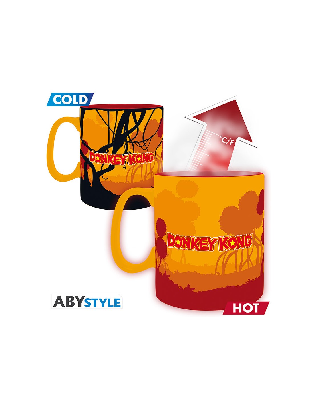 La taza térmica de 460 ml (aproximadamente 15.5 oz) de Abystyle es un artículo divertido e interactivo que rinde homenaje a la legendaria franquicia de Nintendo. Fabricada en cerámica de alta calidad, el diseño utiliza tinta termosensible que reacciona a los cambios de temperatura. Cuando la taza está fría, la superficie es predominantemente oscura (negra y naranja), mostrando la silueta en negro de Donkey Kong en la jungla.