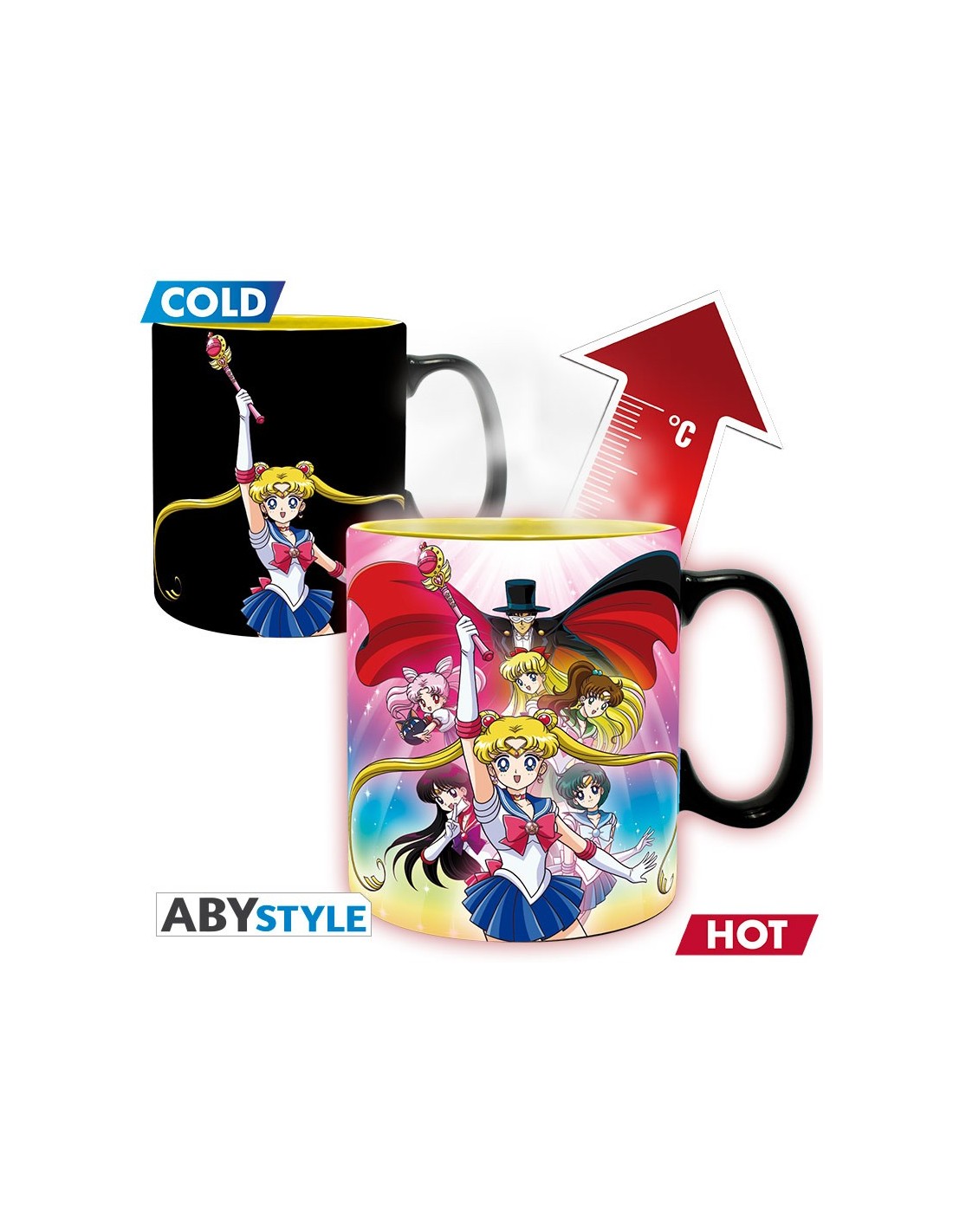Lo más destacado de esta taza es su función térmica, que revela un diseño especial cuando se vierte líquido caliente en su interior. Disfruta viendo cómo aparecen las imágenes del grupo de Sailor Scouts mientras tu bebida favorita toma forma en la taza.