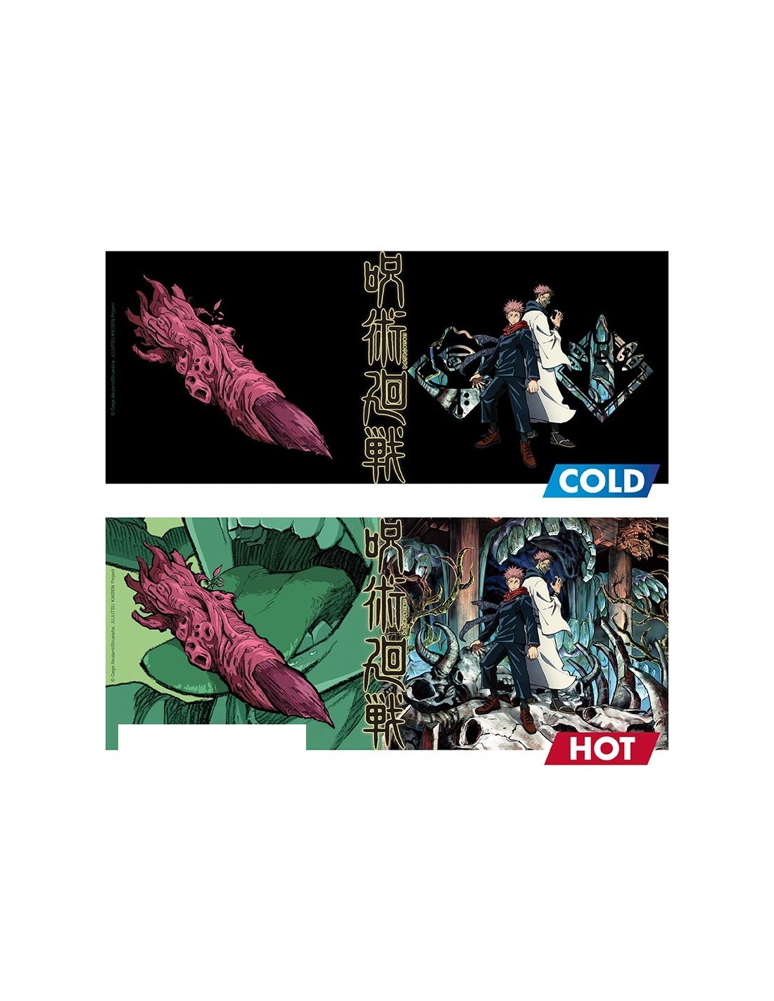 Cuando la taza está fría, solo se distingue la silueta de los protagonistas sobre un fondo oscuro. Sin embargo, al verter una bebida caliente, la magia se activa y se revela un impresionante arte en alta calidad, con detalles vibrantes que representan el conflicto entre Itadori y su alter ego maldito, Sukuna.