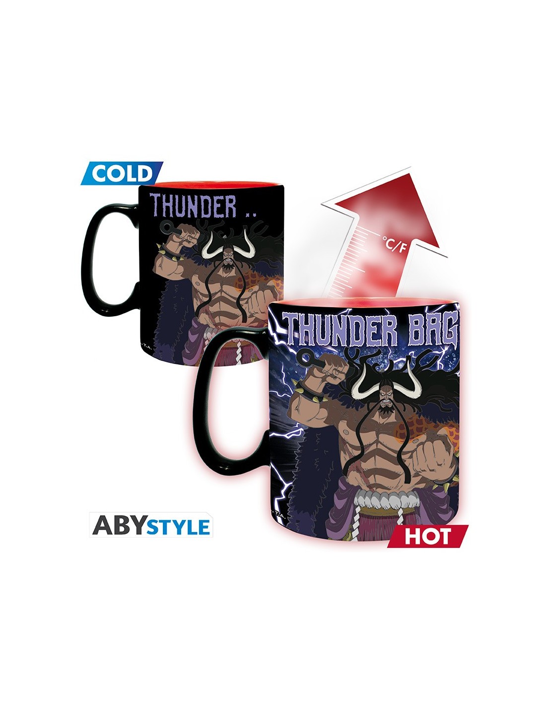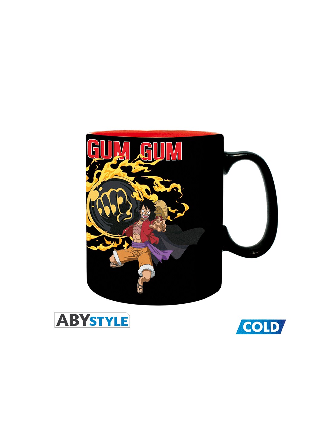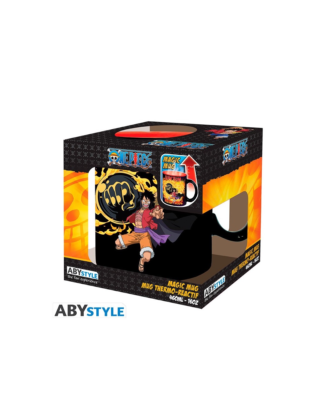 Al estar fría, la taza muestra un diseño discreto con el logo de One Piece y detalles del arco de Wano. Pero al verter líquido caliente, el calor activa la tinta termocromática, revelando un impresionante arte de Monkey D. Luffy enfrentándose a Kaidou, uno de los Yonko. Las ilustraciones están llenas de energía y reflejan la intensidad de uno de los combates más esperados del anime.