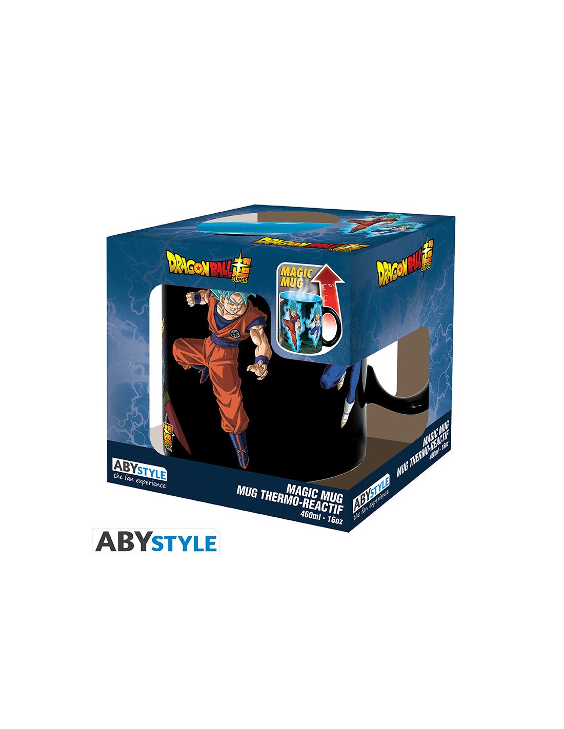 Fabricada con cerámica de alta calidad, la taza presenta un diseño inicial que esconde la sorpresa. Cuando viertes una bebida caliente (café, té, chocolate, etc.), la ilustración en la superficie cambia, revelando una intensa escena de batalla donde Goku y Vegeta se enfrentan a Goku Black, a menudo incluyendo a Zamasu fusionado o elementos icónicos de la saga del Futuro. Los colores vibrantes y el arte dinámico capturan la esencia de las batallas de Dragon Ball.