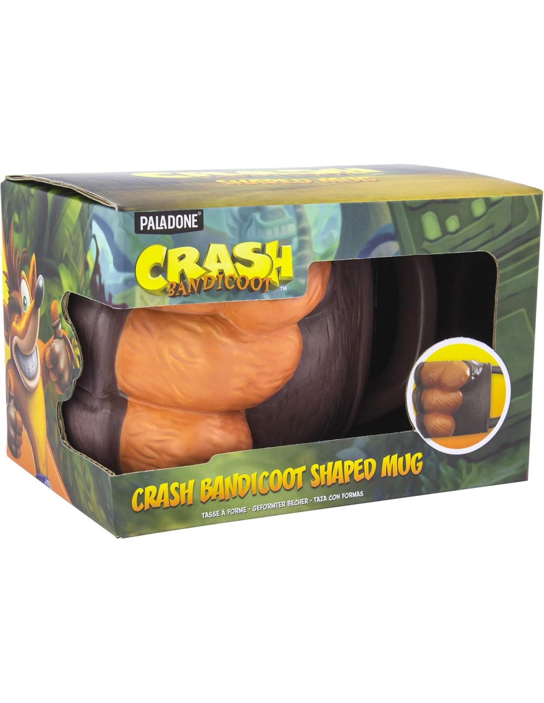 Esta original taza de cerámica Paladone está diseñada como un puño cerrado en 3D, en homenaje al excéntrico y energético Crash Bandicoot, uno de los personajes más emblemáticos del universo de los videojuegos.