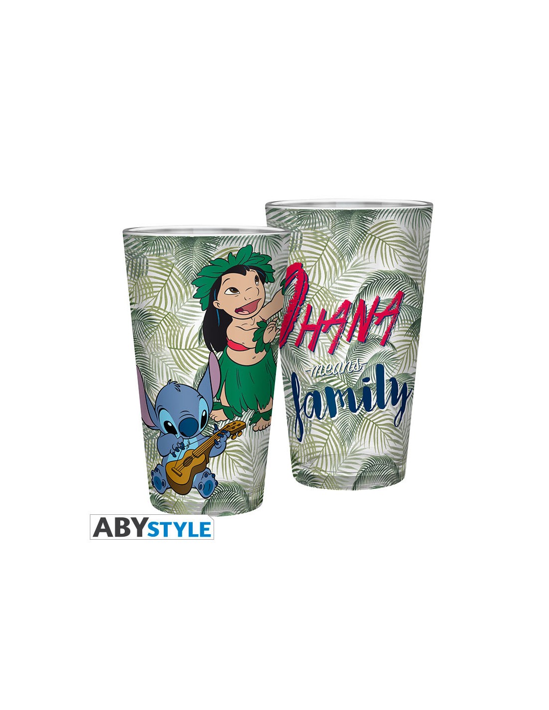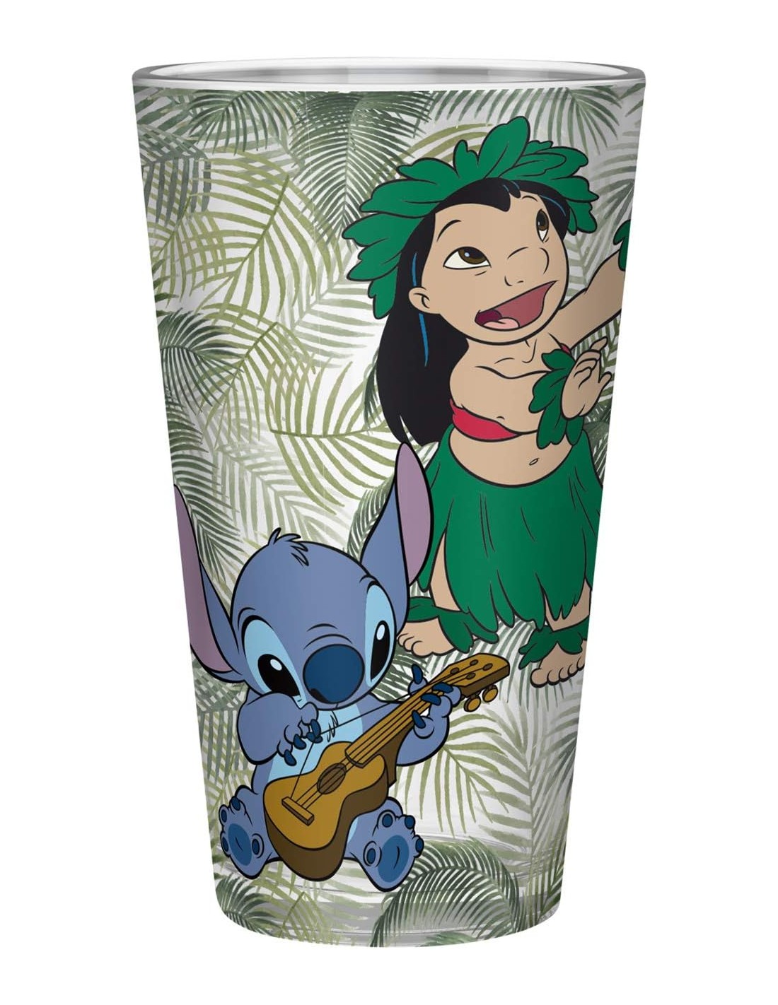 El vaso de Abystyle es un artículo alegre y colorido, perfecto para los fans de la película de Disney ambientada en Hawái. El fondo del vaso está cubierto por un patrón continuo de hojas de palmera verde, creando un ambiente tropical envolvente. En el anverso, la ilustración muestra a Lilo en su atuendo de hula tradicional, con una expresión de felicidad, mientras que Stitch (Experimento 626), está sentado y tocando un ukelele, simbolizando la integración de Stitch en la cultura y familia hawaiana.