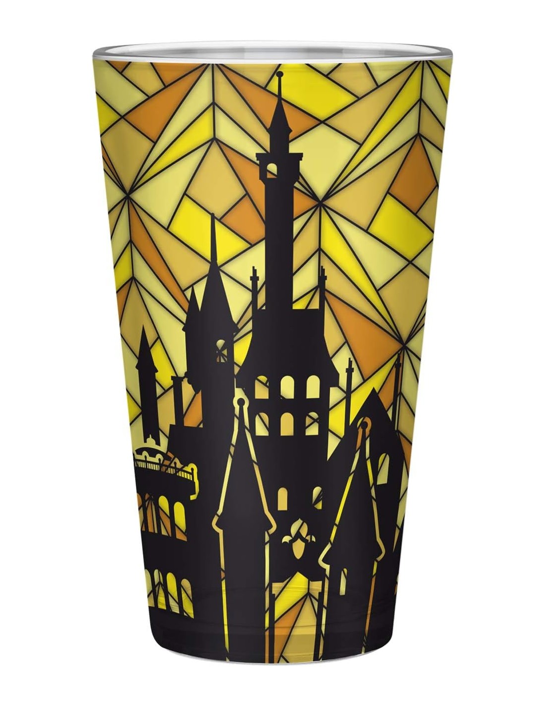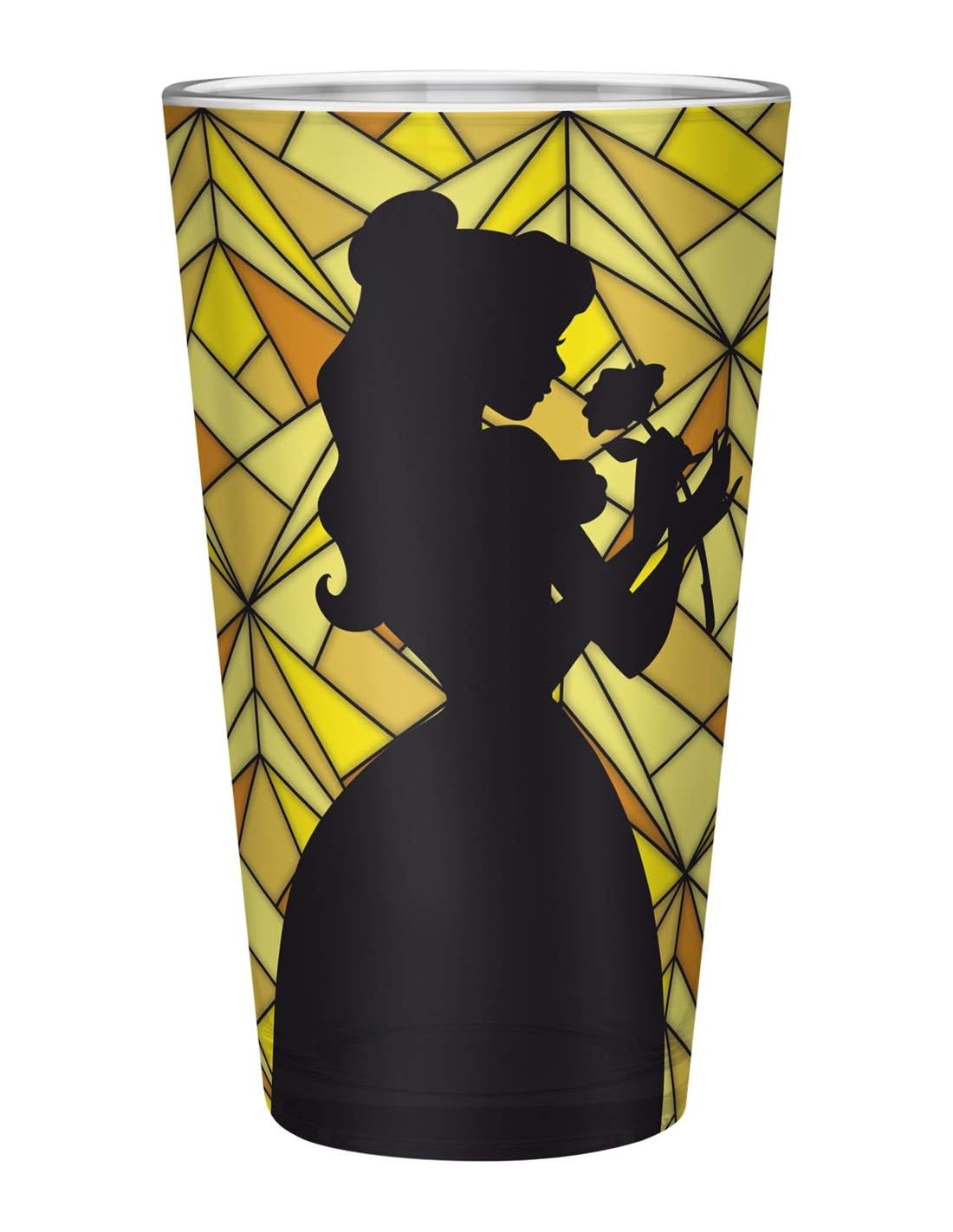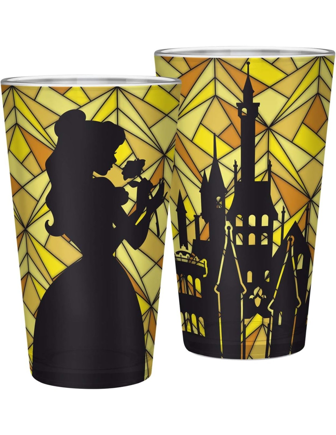 El vaso de Abystyle es un artículo elegante y distintivo para los fans de la historia de Bella y Bestia. El diseño se basa en la hermosa y dramática estética de las vidrieras que a menudo se utilizan para contar la historia de la película. El fondo presenta un patrón de polígonos irregulares en tonos dorados, ámbar y amarillos, simulando el vidrio coloreado y brillante de una vidriera.