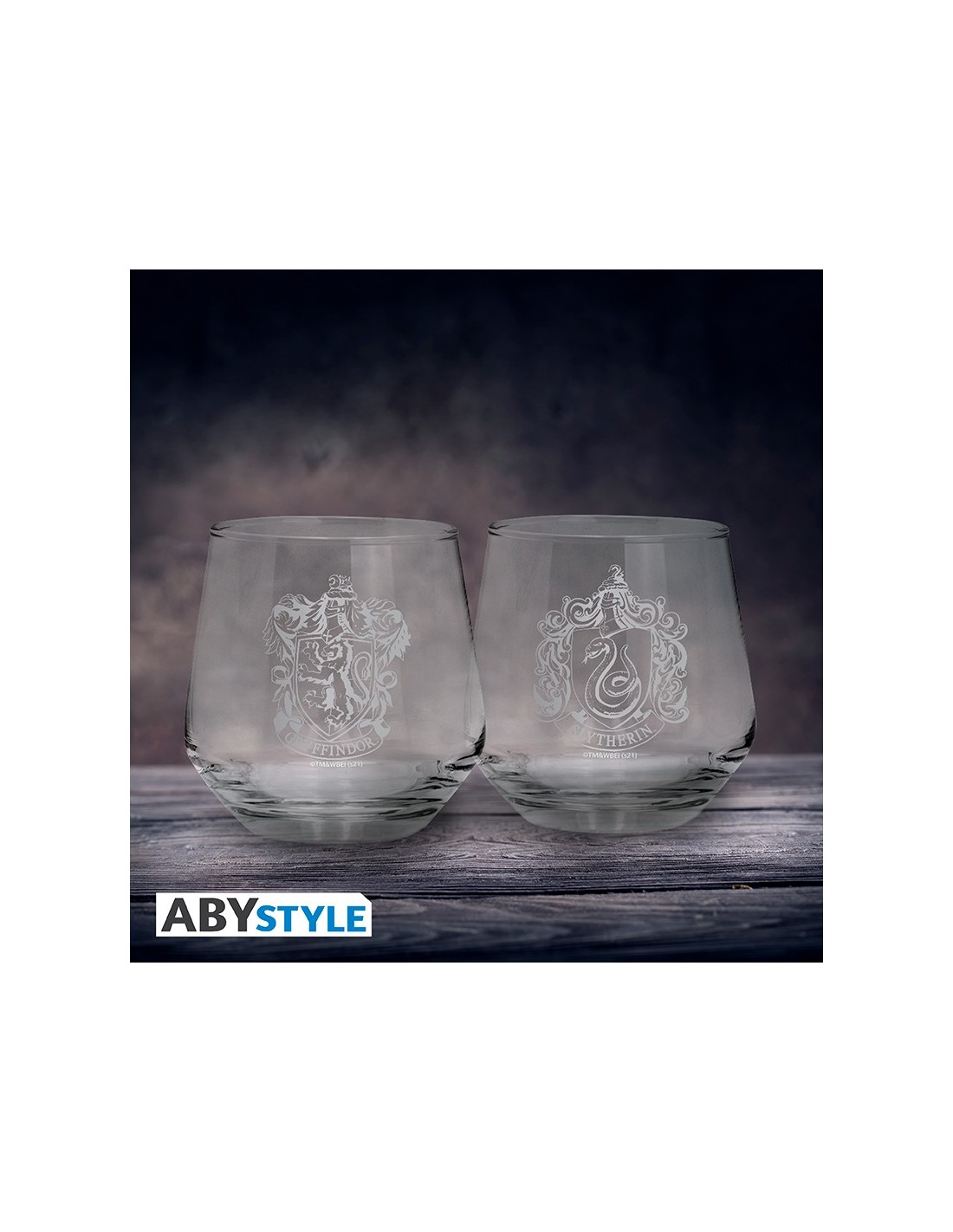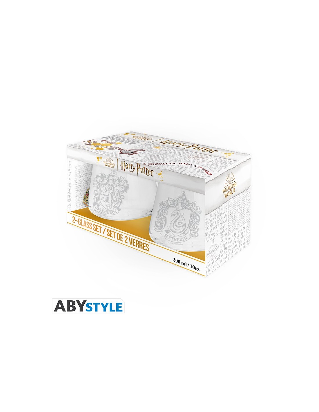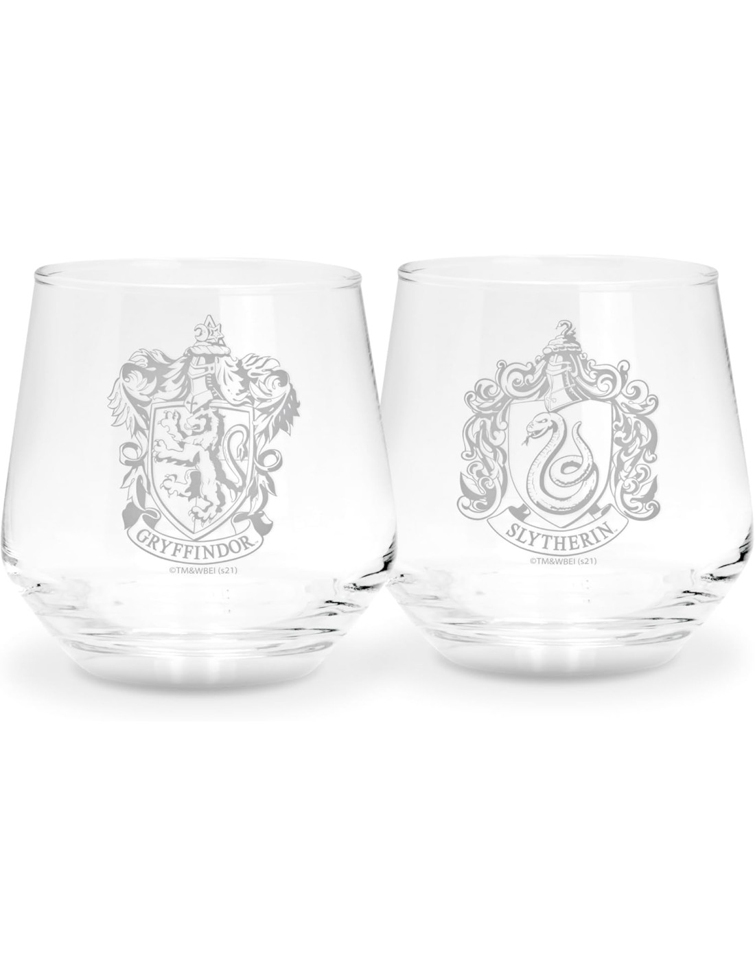 El set incluye dos vasos, cada uno decorado con los emblemas detallados de las casas Gryffindor y Slytherin. Los colores vibrantes y los escudos de armas fielmente reproducidos representan el valor de los Gryffindor y la astucia de los Slytherin, permitiendo a los fans mostrar su lealtad a su casa favorita.