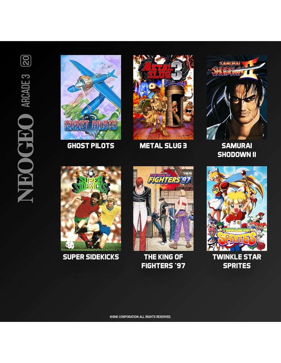 Incluye varios juegos destacados del catálogo NEOGEO (la lista concreta depende de la edición), abarcando géneros como lucha, acción y run & gun, manteniendo intacta la esencia que convirtió a NEOGEO en un icono de los salones recreativos.